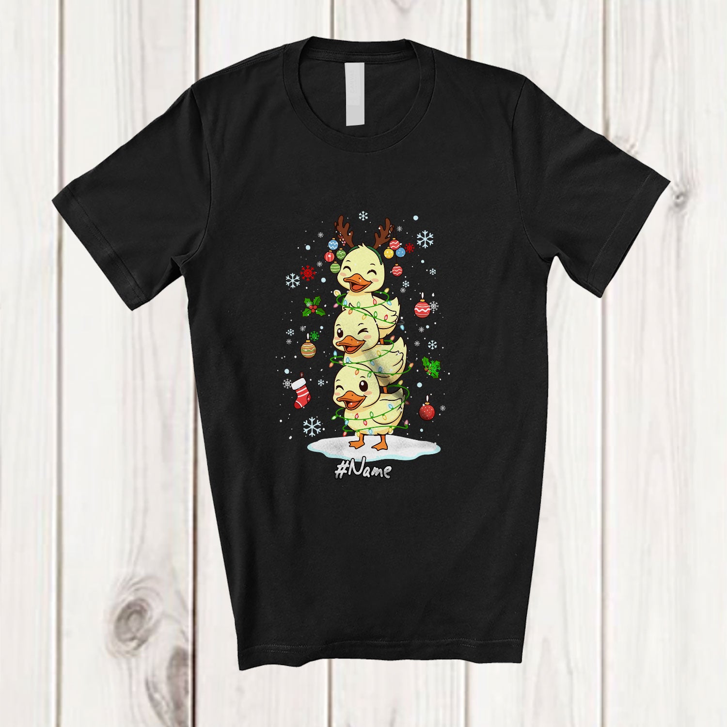• Personalized Custom Name Duck Reindeer Christmas Tree; Lovely X-mas Lights Farm Farmer T-Shirt. This cotton t-shirt is a durable staple product with a classic fit. One of the most popular items, it has a relaxed style made for everyday and casual wear.