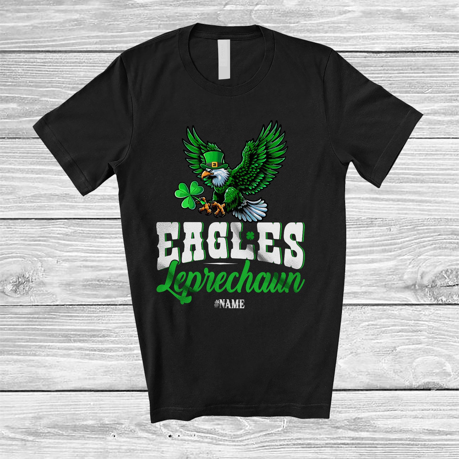 • Personalized Custom Name Eagles Leprechaun; Cheerful St. Patrick's Day Flying Eagles With Shamrock T-Shirt. This cotton t-shirt is a durable staple product with a classic fit. One of the most popular items, it has a relaxed style made for everyday and casual wear.