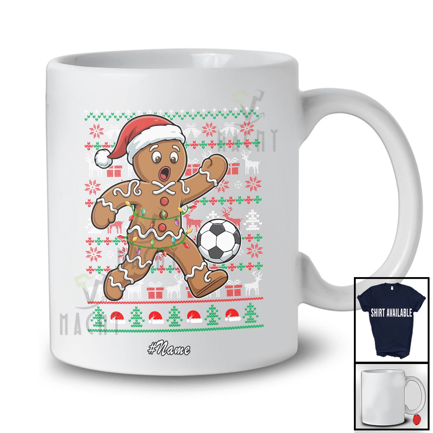 Personalized Custom Name Gingerbread Playing Soccer; Humorous Christmas Sweater Player T-Shirt. This cotton t-shirt is a durable staple product with a classic fit. One of the most popular items, it has a relaxed style made for everyday and casual wear.