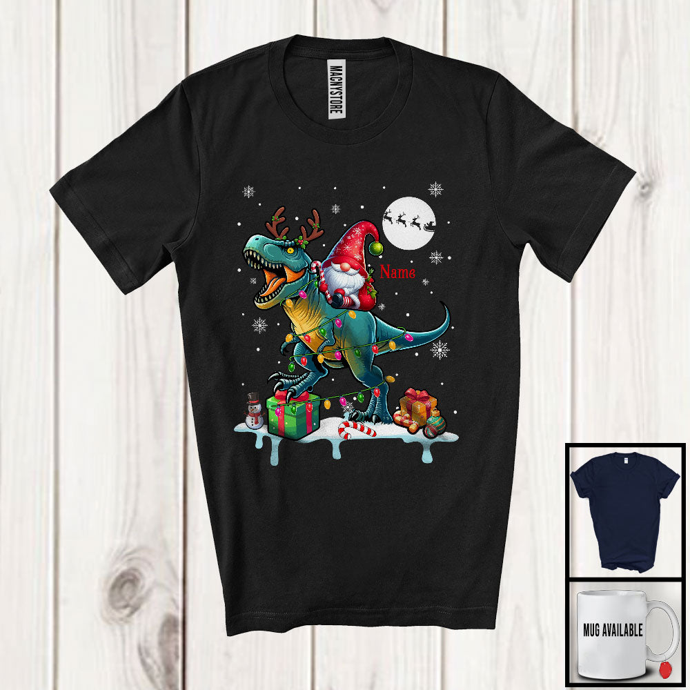 Personalized Custom Name Gnome Riding Reindeer T-Rex; Adorable Christmas Lights Snow T-Shirt