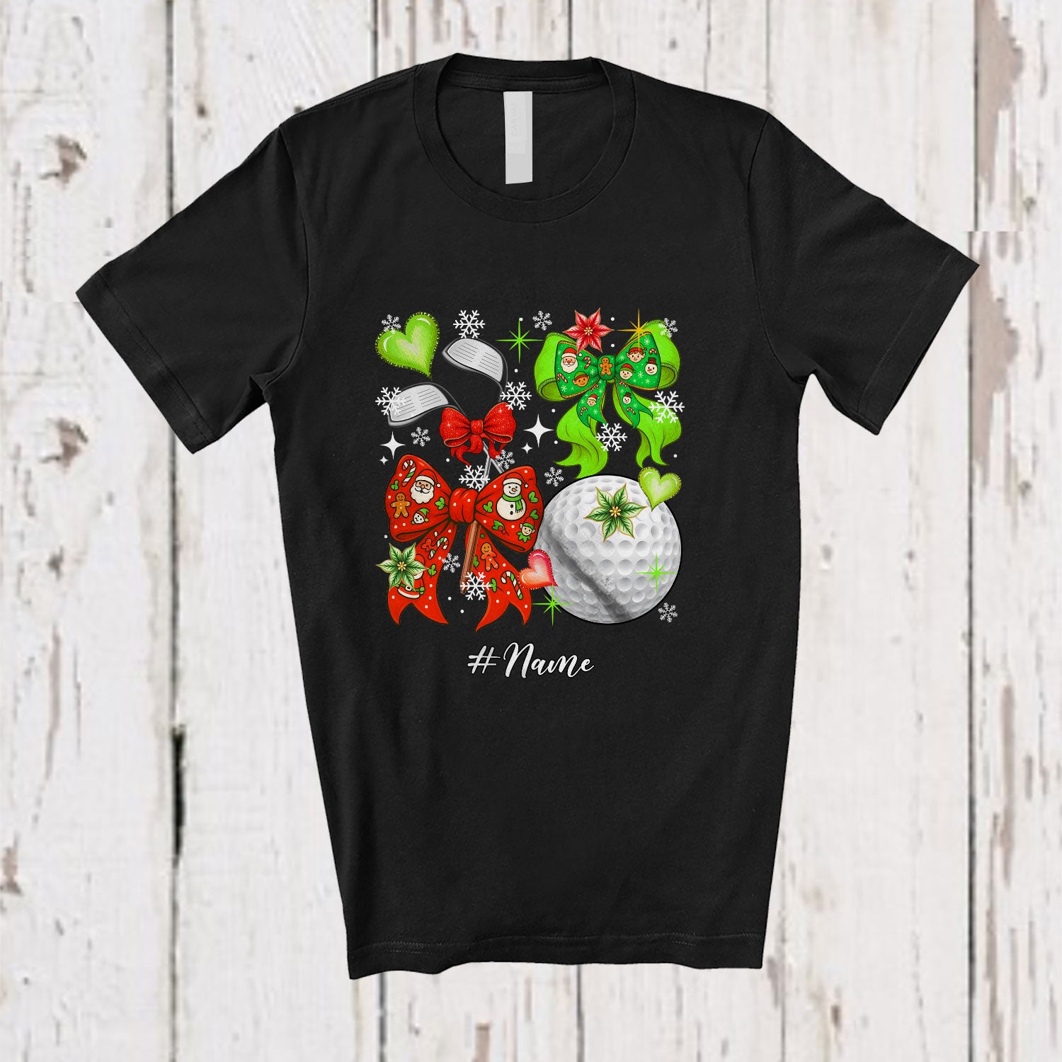 Personalized Custom Name Golf Christmas Coquette; Lovely Bow Tie Snowing; Sport Player T-Shirt. This cotton t-shirt is a durable staple product with a classic fit. One of the most popular items, it has a relaxed style made for everyday and casual wear.