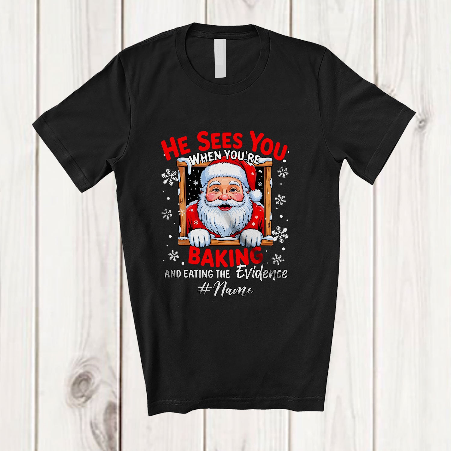 • Personalized Custom Name He Sees You Baking; Humorous Christmas Santa Face; Cookie Baker T-Shirt. This cotton t-shirt is a durable staple product with a classic fit. One of the most popular items, it has a relaxed style made for everyday and casual wear.