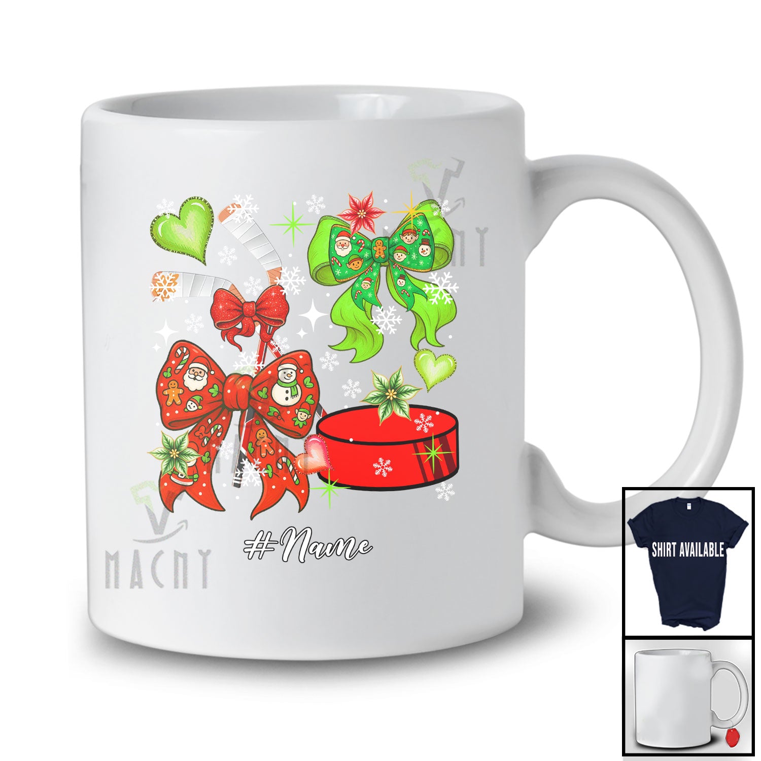 Personalized Custom Name Hockey Christmas Coquette; Lovely Bow Tie Snowing; Sport Player T-Shirt. This cotton t-shirt is a durable staple product with a classic fit. One of the most popular items, it has a relaxed style made for everyday and casual wear.