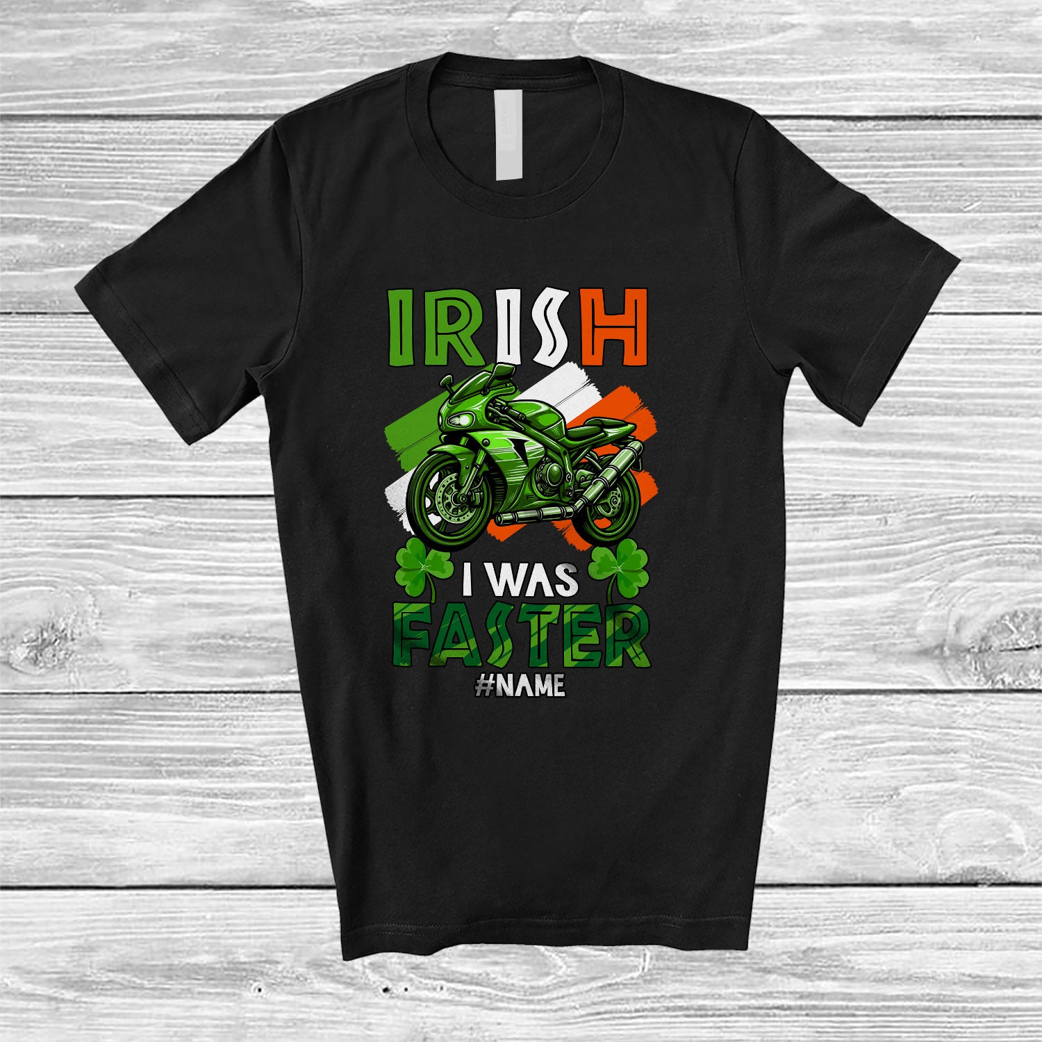 Personalized Custom Name Irish I Was Faster; Joyful St. Patrick's Day Riding Motorbike Leprechaun T-Shirt