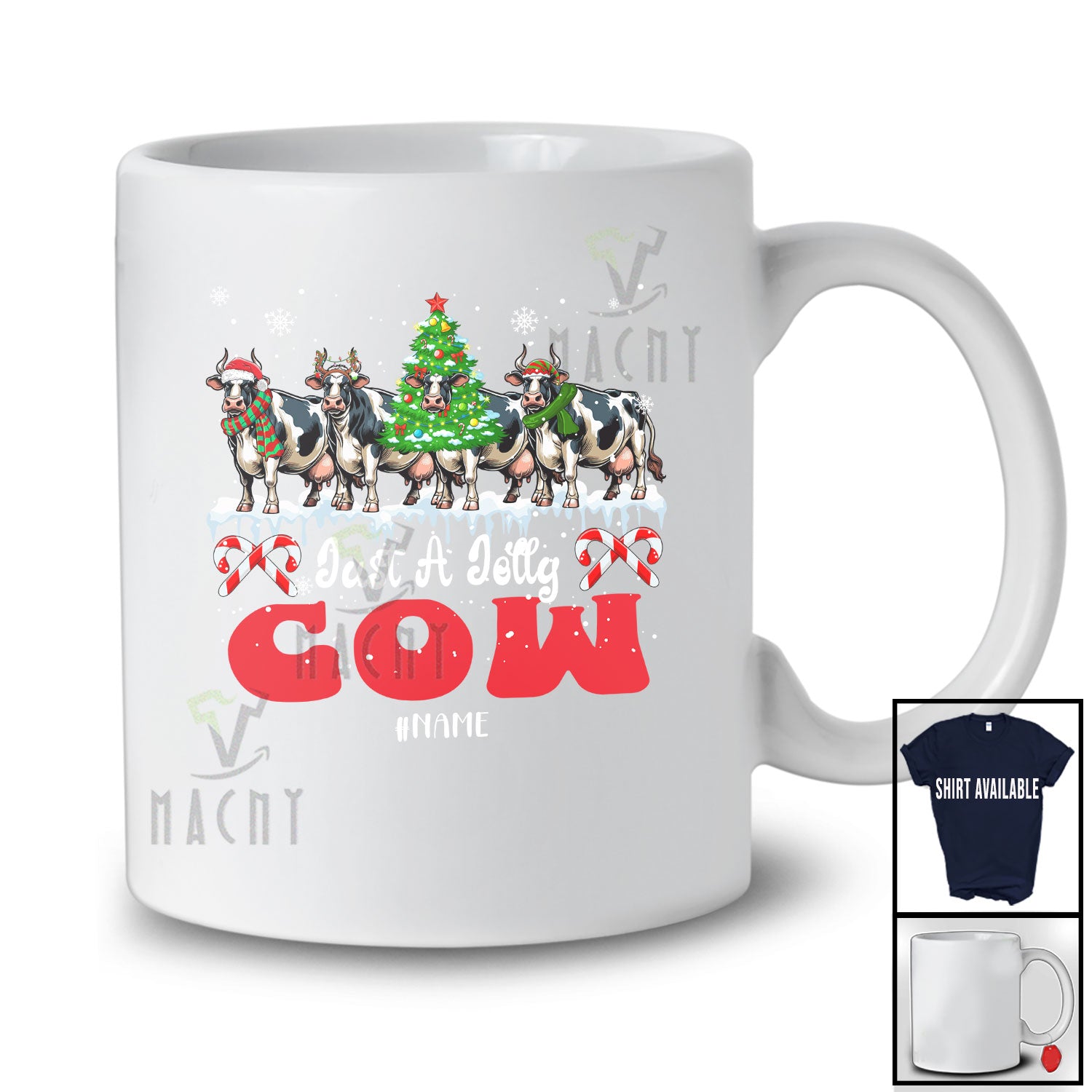 Personalized Custom Name Just A Jolly Cow; Adorable Christmas Tree Santa Elf Farm Farmer T-Shirt. This cotton t-shirt is a durable staple product with a classic fit. One of the most popular items, it has a relaxed style made for everyday and casual wear.