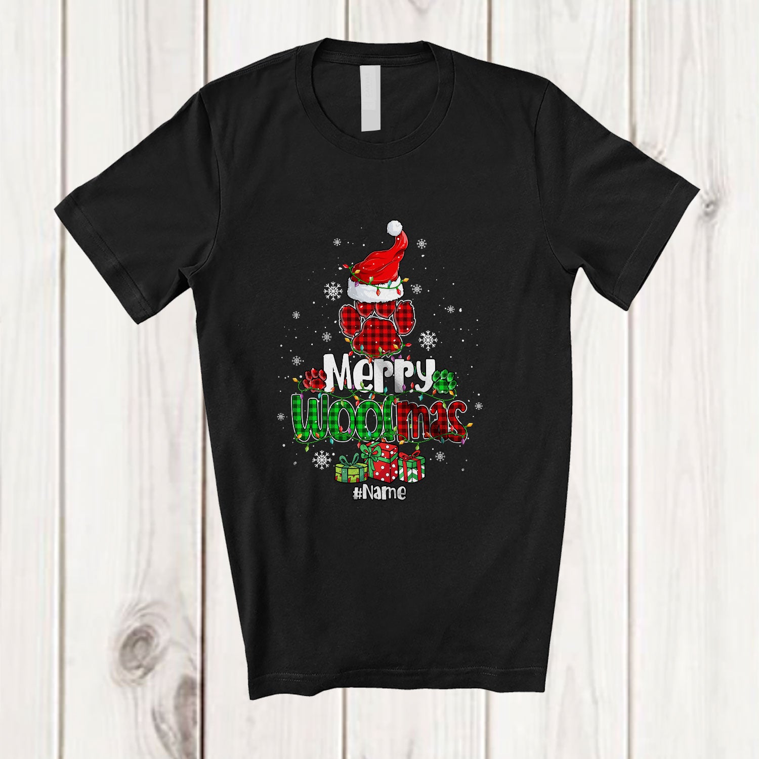 Every product is unique, just like you. If you're looking for a product that fits the mold of your life, the Personalized Custom Name Merry Woofmas; Wonderful Christmas Tree Santa Plaid Dog Paws T-Shirt is for you.