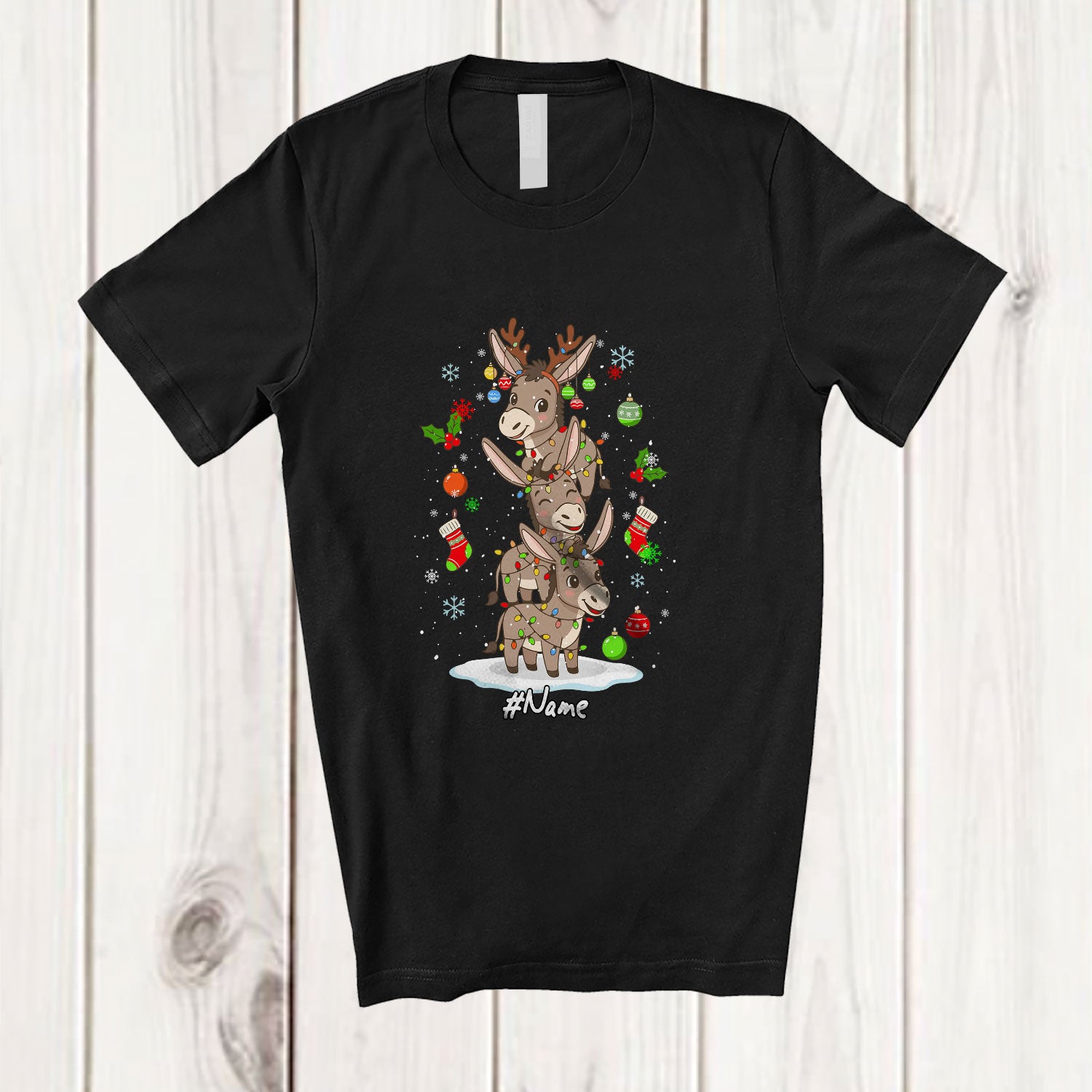 Personalized Custom Name Mule Reindeer Christmas Tree; Lovely X-mas Lights Farm Farmer T-Shirt. This cotton t-shirt is a durable staple product with a classic fit. One of the most popular items, it has a relaxed style made for everyday and casual wear.