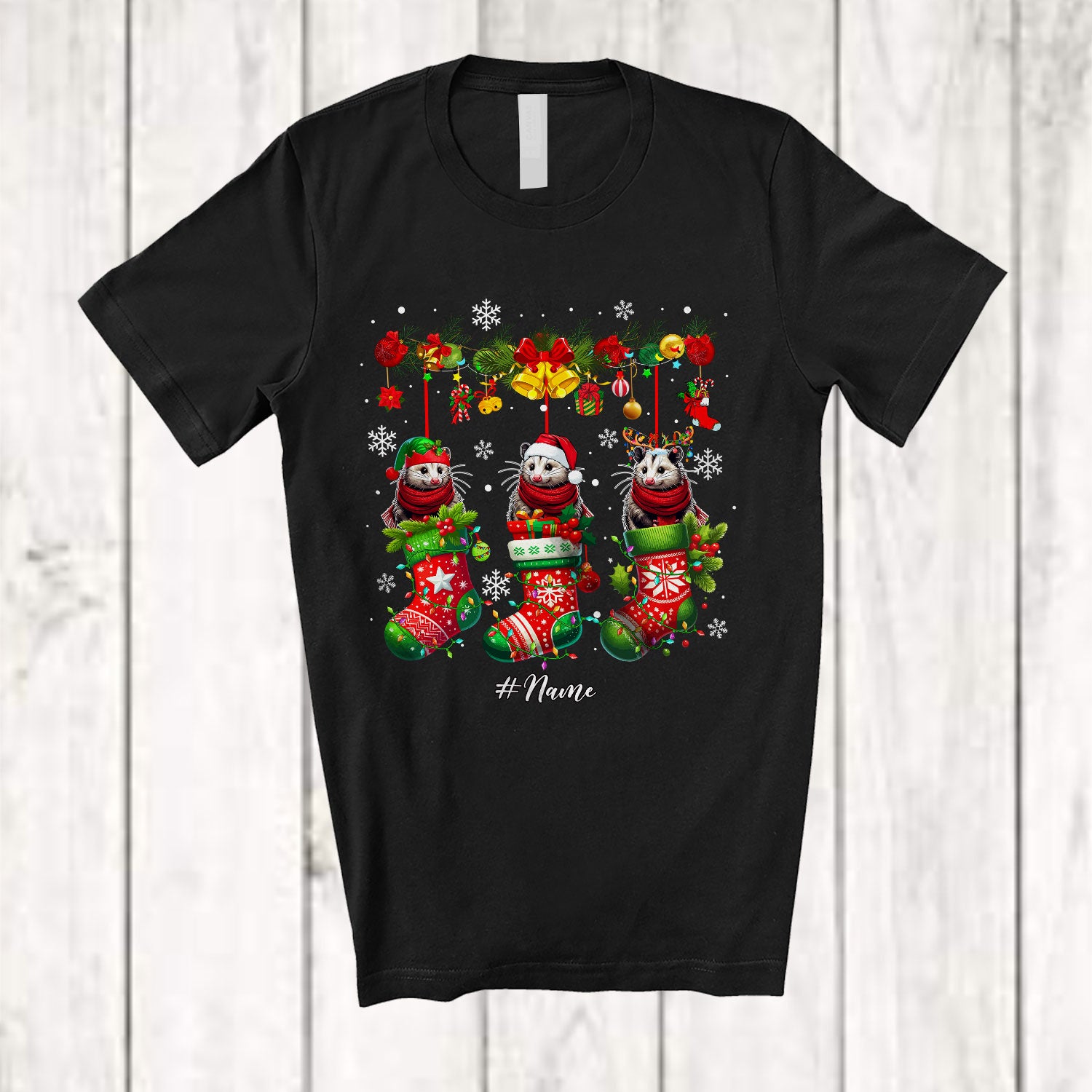 Personalized Custom Name Opossum In Three Christmas Socks; Lovely X-mas Lights Snow T-Shirt