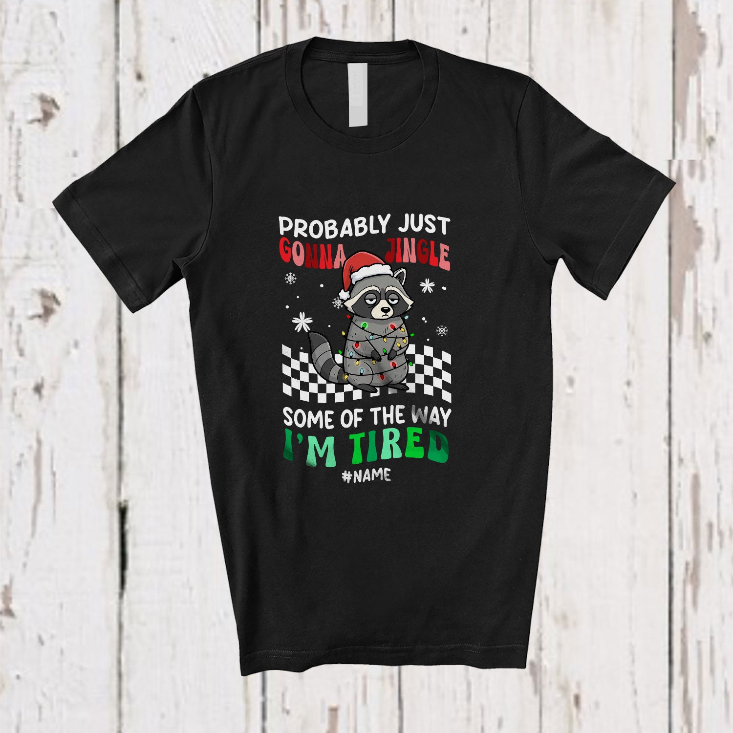 Personalized Custom Name Probably Just Gonna Jingle; Sarcastic Christmas Santa Tired Raccoon T-Shirt