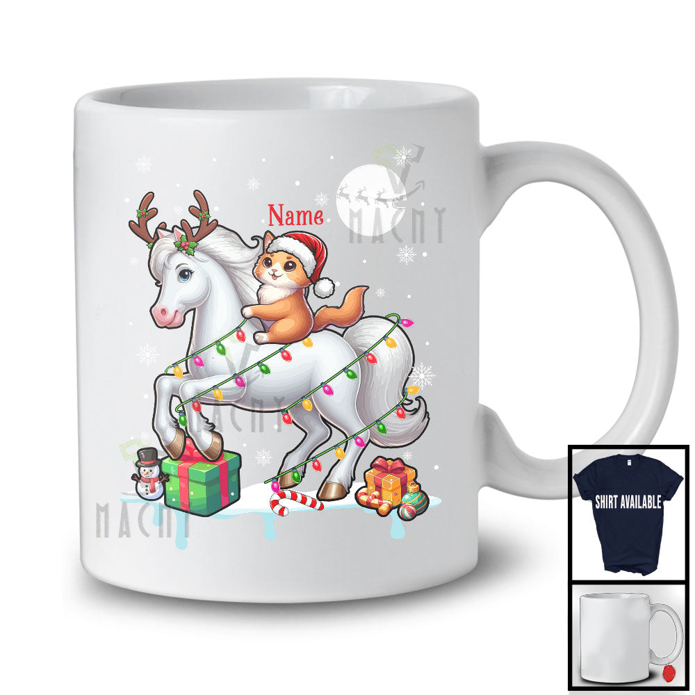 • Personalized Custom Name Santa Cat Riding Reindeer Horse; Adorable Christmas Lights Snow T-Shirt. This cotton t-shirt is a durable staple product with a classic fit. One of the most popular items, it has a relaxed style made for everyday and casual wear.