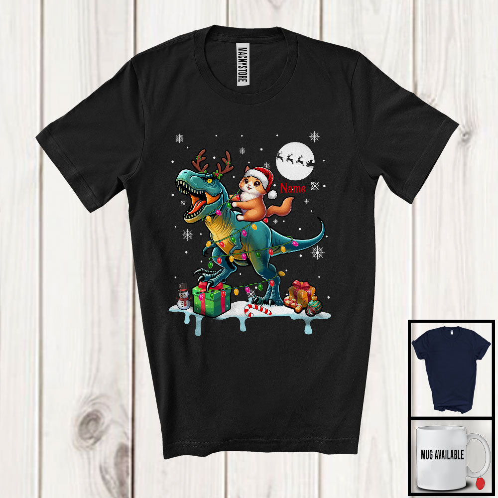 Personalized Custom Name Santa Cat Riding Reindeer T-Rex; Adorable Christmas Lights Snow T-Shirt
