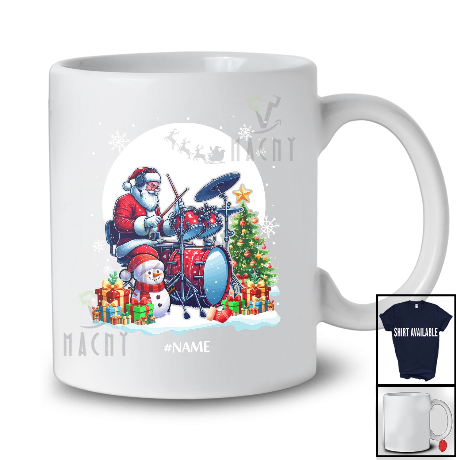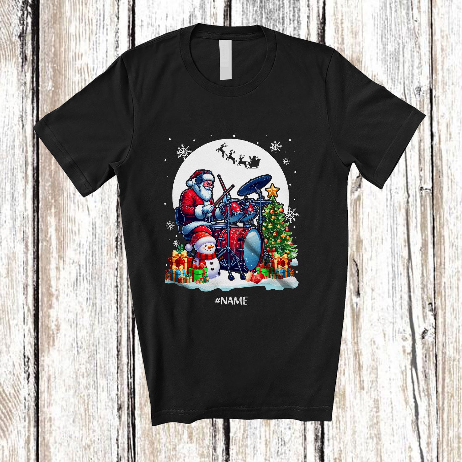 Personalized Custom Name Santa Playing Drum; Joyful Christmas Moon Tree Snowman; Family T-Shirt
