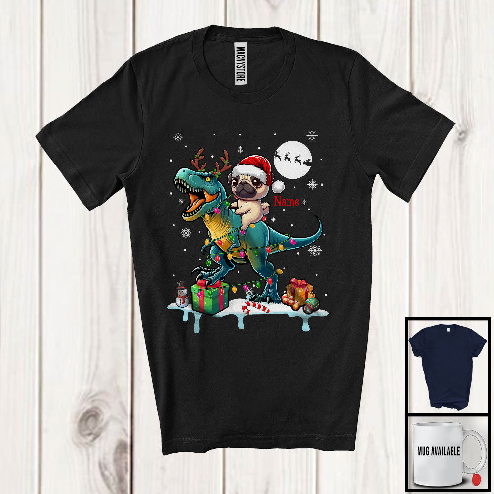 Personalized Custom Name Santa Pug Riding Reindeer T-Rex; Adorable Christmas Lights Snow T-Shirt