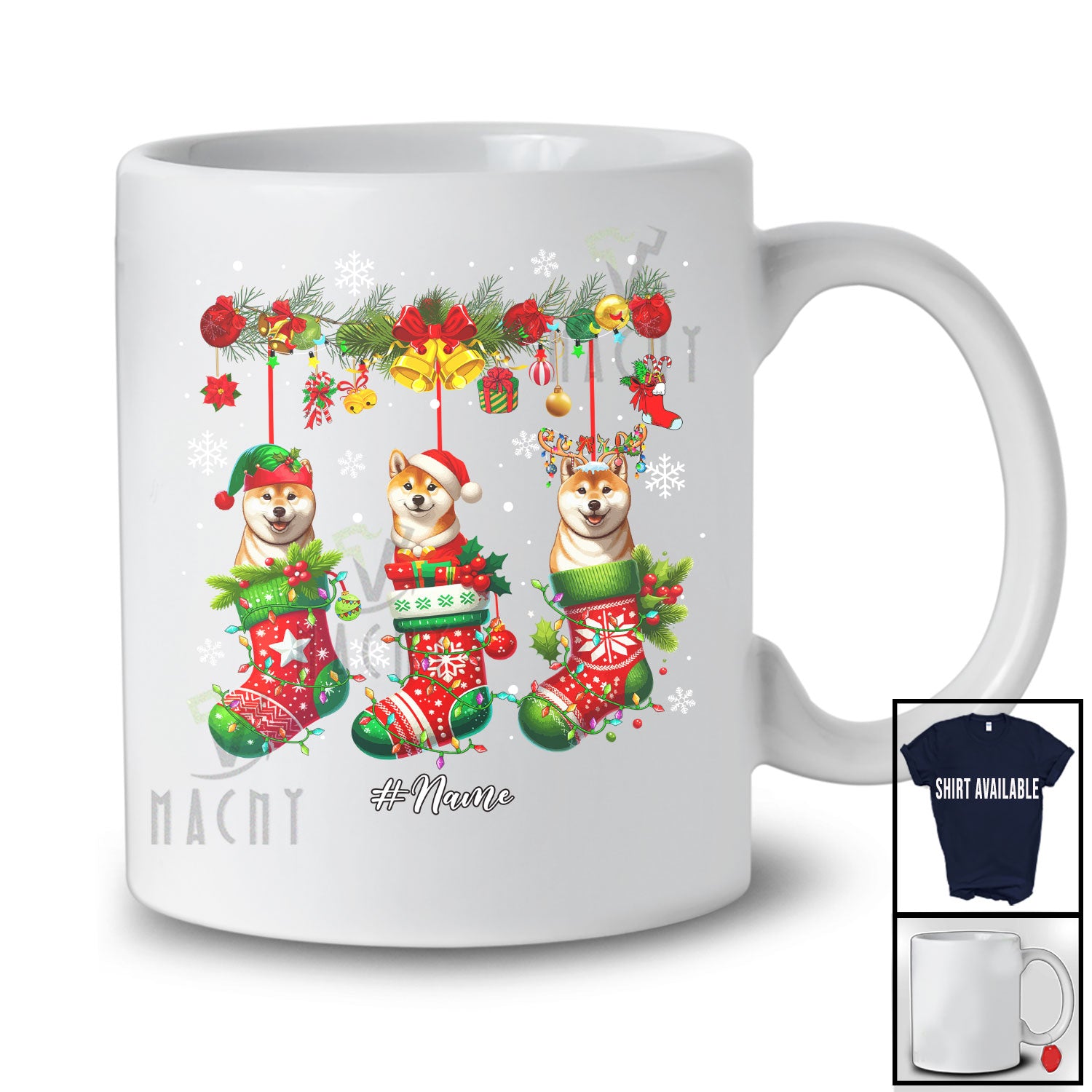 Personalized Custom Name Shiba Inu Dog In Three Christmas Socks; Lovely X-mas Lights Snow T-Shirt. This cotton t-shirt is a durable staple product with a classic fit. One of the most popular items, it has a relaxed style made for everyday and casual wear.