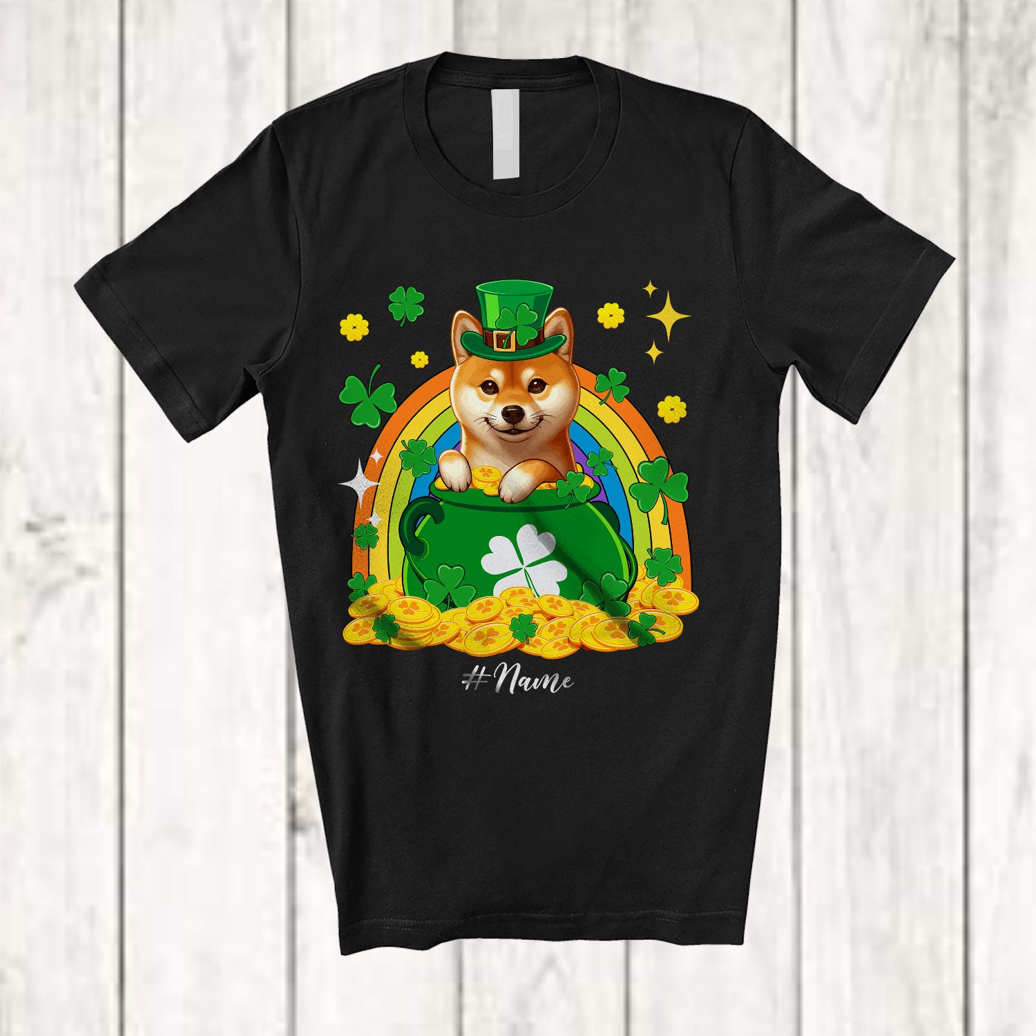 • Personalized Custom Name Shiba Inu Leprechaun In Pot Of Gold; Lovely St. Patrick's Day Rainbow T-Shirt. This cotton t-shirt is a durable staple product with a classic fit. One of the most popular items, it has a relaxed style made for everyday and casual wear.