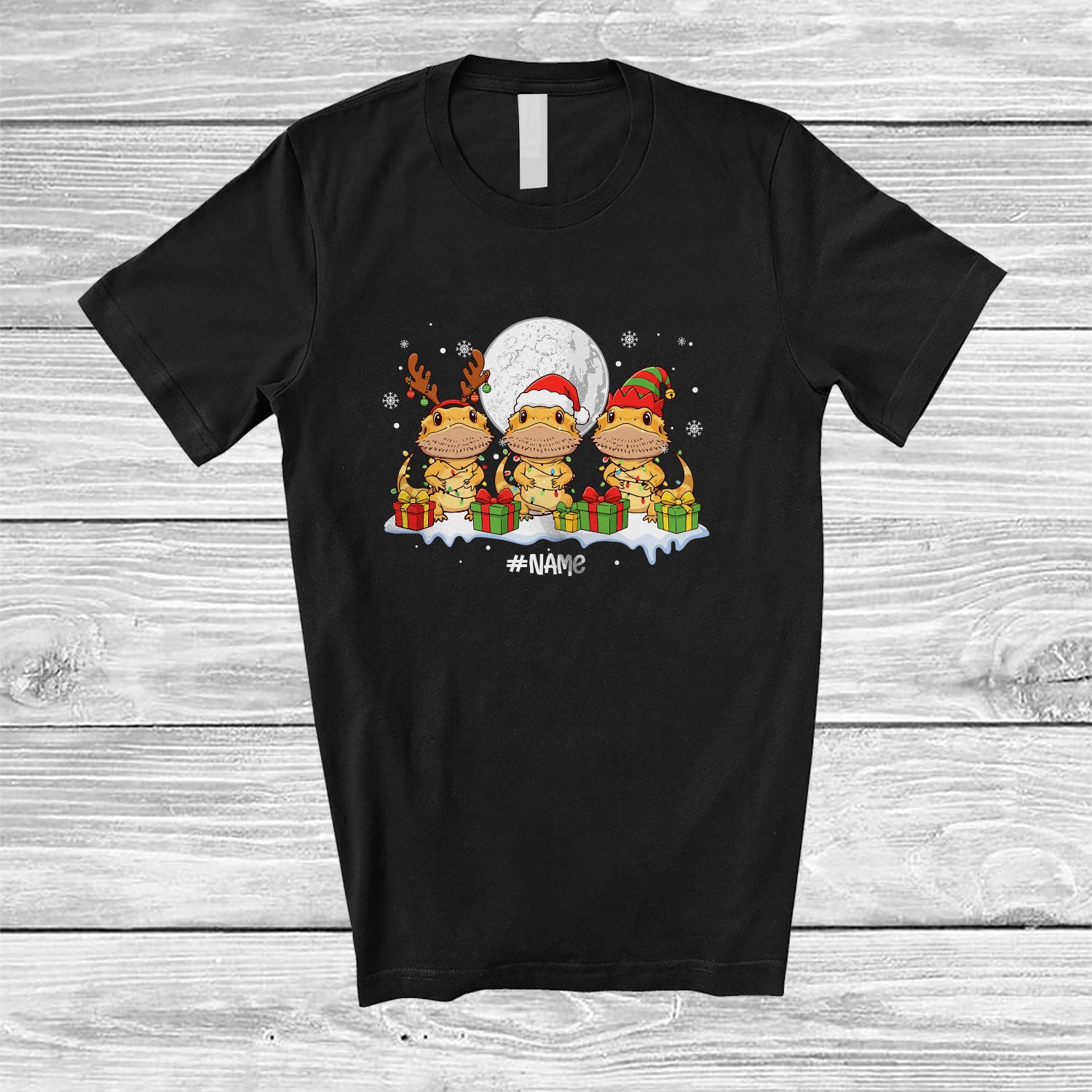 • Personalized Custom Name Three Santa Elf Bearded Dragon; Amusing Christmas Moon Snowing Animal T-Shirt. This cotton t-shirt is a durable staple product with a classic fit. One of the most popular items, it has a relaxed style made for everyday and casual wear.