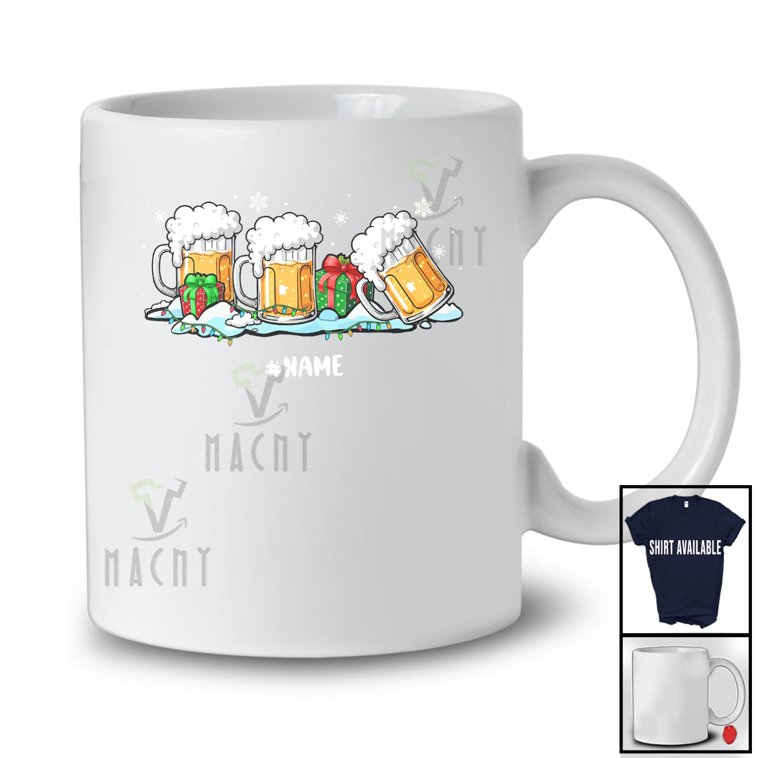 Personalized Custom Name Three X-mas Beer Glasses; Amazing Christmas Lights Snow Drinking T-Shirt. This cotton t-shirt is a durable staple product with a classic fit. One of the most popular items, it has a relaxed style made for everyday and casual wear.