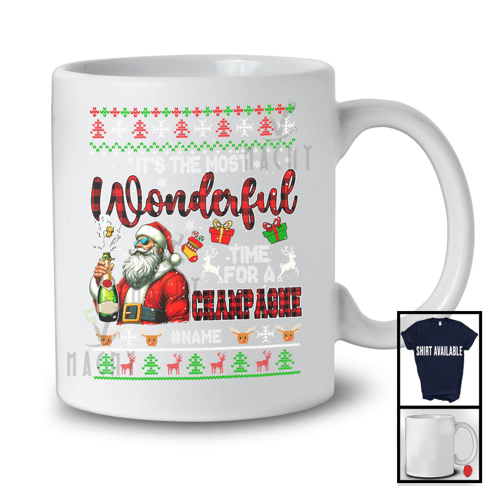 Personalized Custom Name Time For A Champagne; Wonderful Christmas Sweater Santa Drinking; Plaid T-Shirt. This cotton t-shirt is a durable staple product with a classic fit. One of the most popular items, it has a relaxed style made for everyday and casual wear.