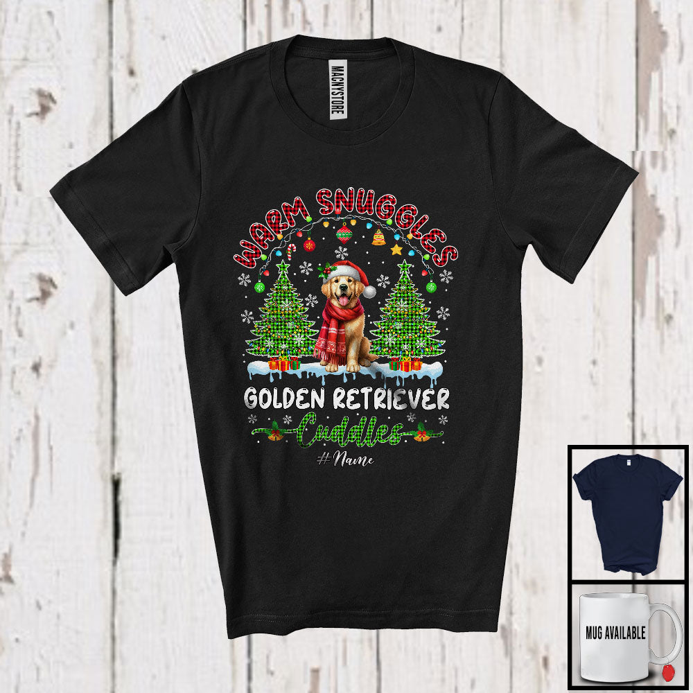 Personalized Custom Name Warm Snuggles Golden Retriever; Fantastic Christmas Lights Tree Plaid T-Shirt. This cotton t-shirt is a durable staple product with a classic fit. One of the most popular items, it has a relaxed style made for everyday and casual wear.