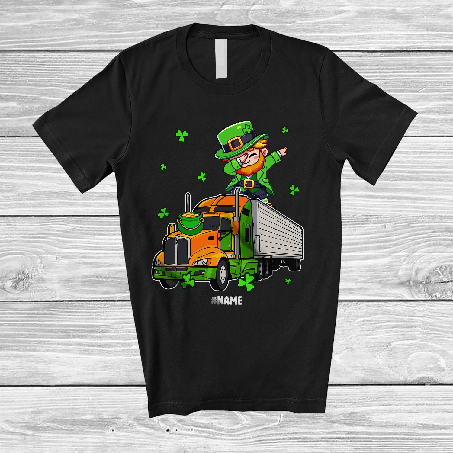 Personalized Dabbing Leprechaun On Truck; Happy St. Patrick's Day Custom Name Boy Driver T-Shirt. This cotton t-shirt is a durable staple product with a classic fit. One of the most popular items, it has a relaxed style made for everyday and casual wear.