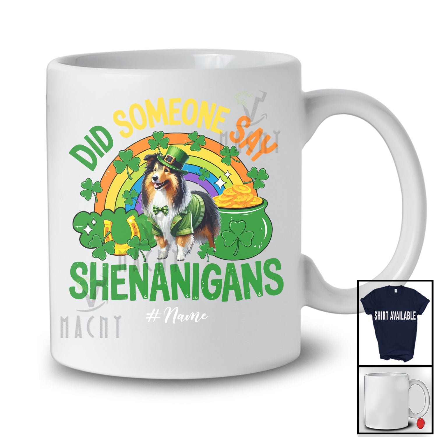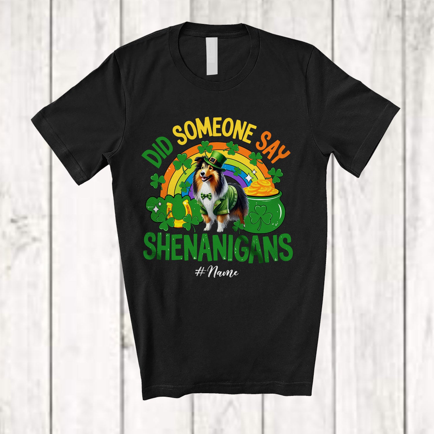 • Personalized Did Someone Say Shenanigans; Lovely St. Patrick's Day Custom Name Shelties Rainbow T-Shirt. This cotton t-shirt is a durable staple product with a classic fit. One of the most popular items, it has a relaxed style made for everyday and casual wear.