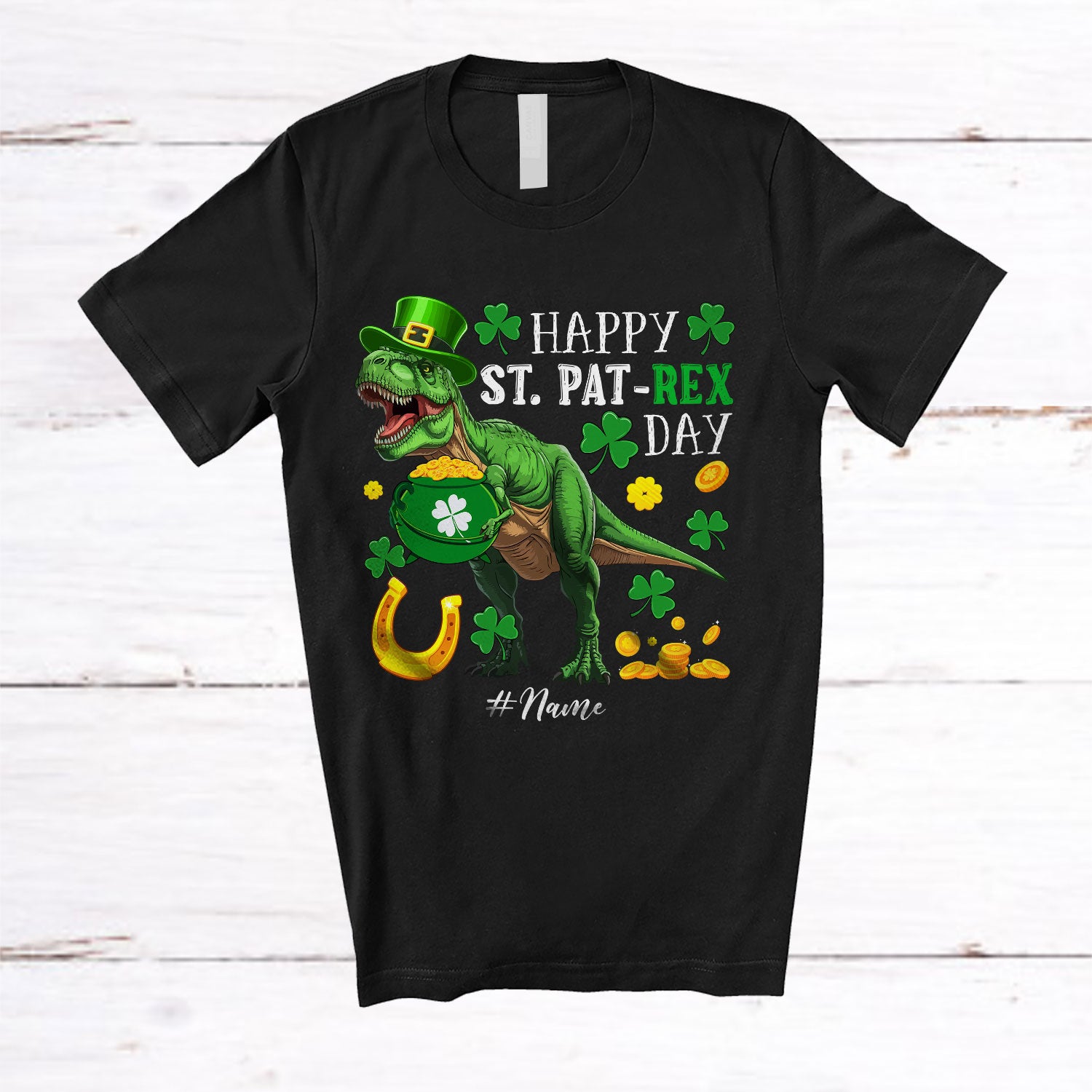 • Personalized Happy St. PaT-Rex Day; Lovely St. Patrick's Day Custom Name T-Rex; Shamrocks T-Shirt. This cotton t-shirt is a durable staple product with a classic fit. One of the most popular items, it has a relaxed style made for everyday and casual wear.