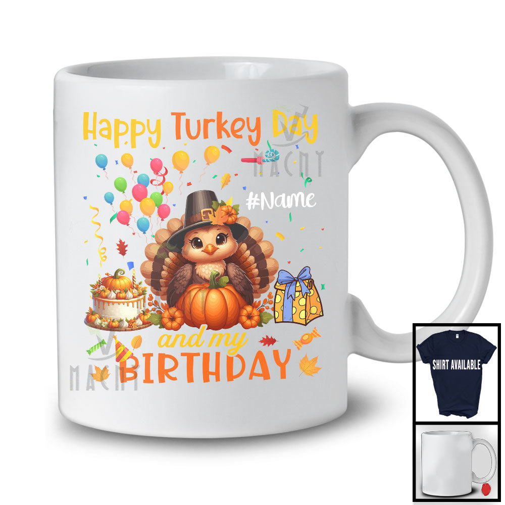 Personalized Happy Turkey Day And My Birthday; Lovely Thanksgiving Custom Name Turkey Pumpkin T-Shirt