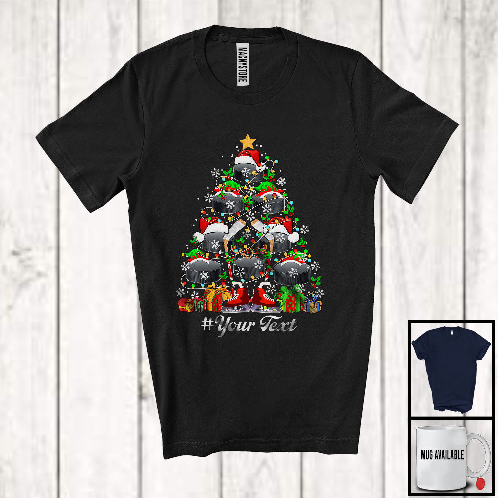 Personalized Hockey Equipment Christmas Tree; Merry X-mas Custom Text Sport Player T-Shirt