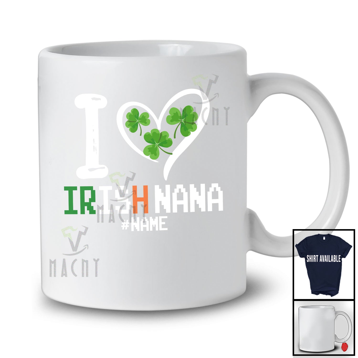 Personalized I Heart Irish Nana; Lovely St. Patrick's Day Shamrocks; Custom Name Family T-Shirt. This cotton t-shirt is a durable staple product with a classic fit. One of the most popular items, it has a relaxed style made for everyday and casual wear.