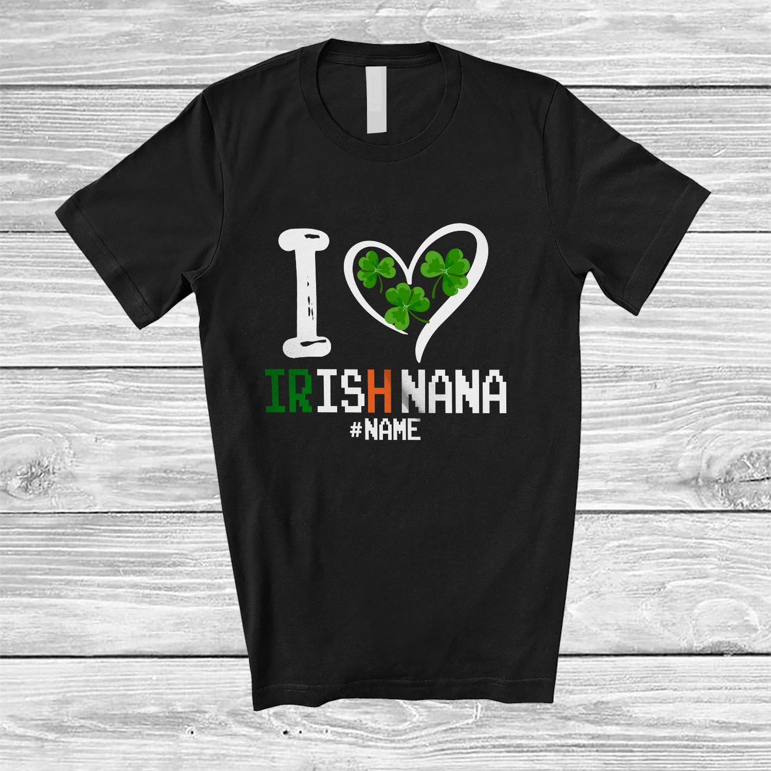 Personalized I Heart Irish Nana; Lovely St. Patrick's Day Shamrocks; Custom Name Family T-Shirt
