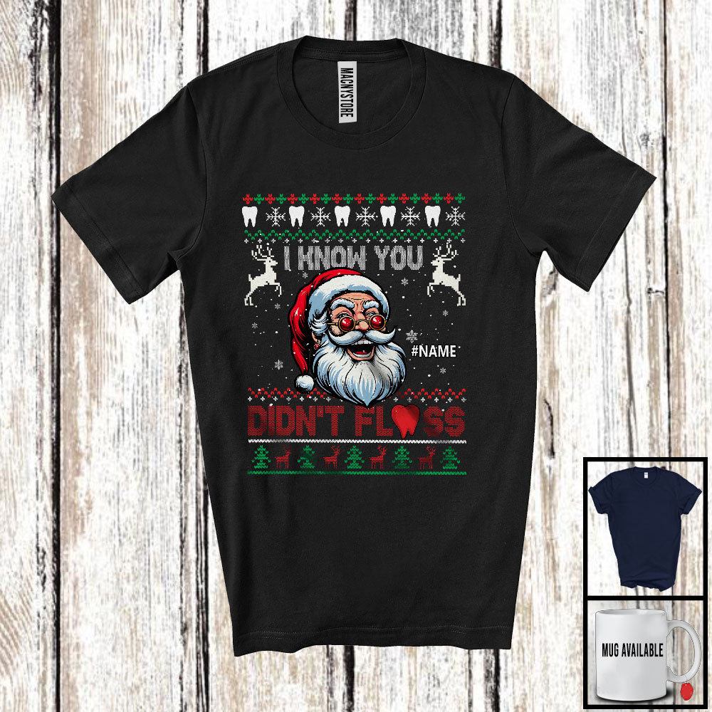 Personalized I Know You Didn't Floss; Joyful Christmas Sweater Santa; Custom Name Dental Dentist T-Shirt