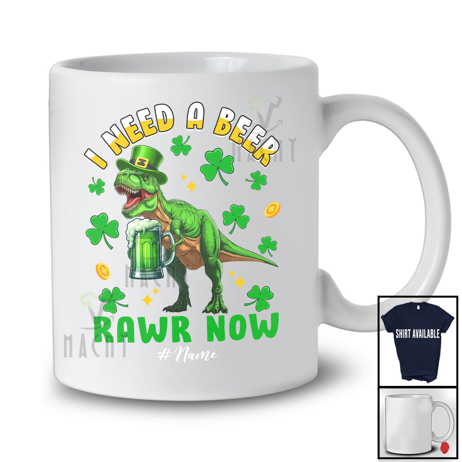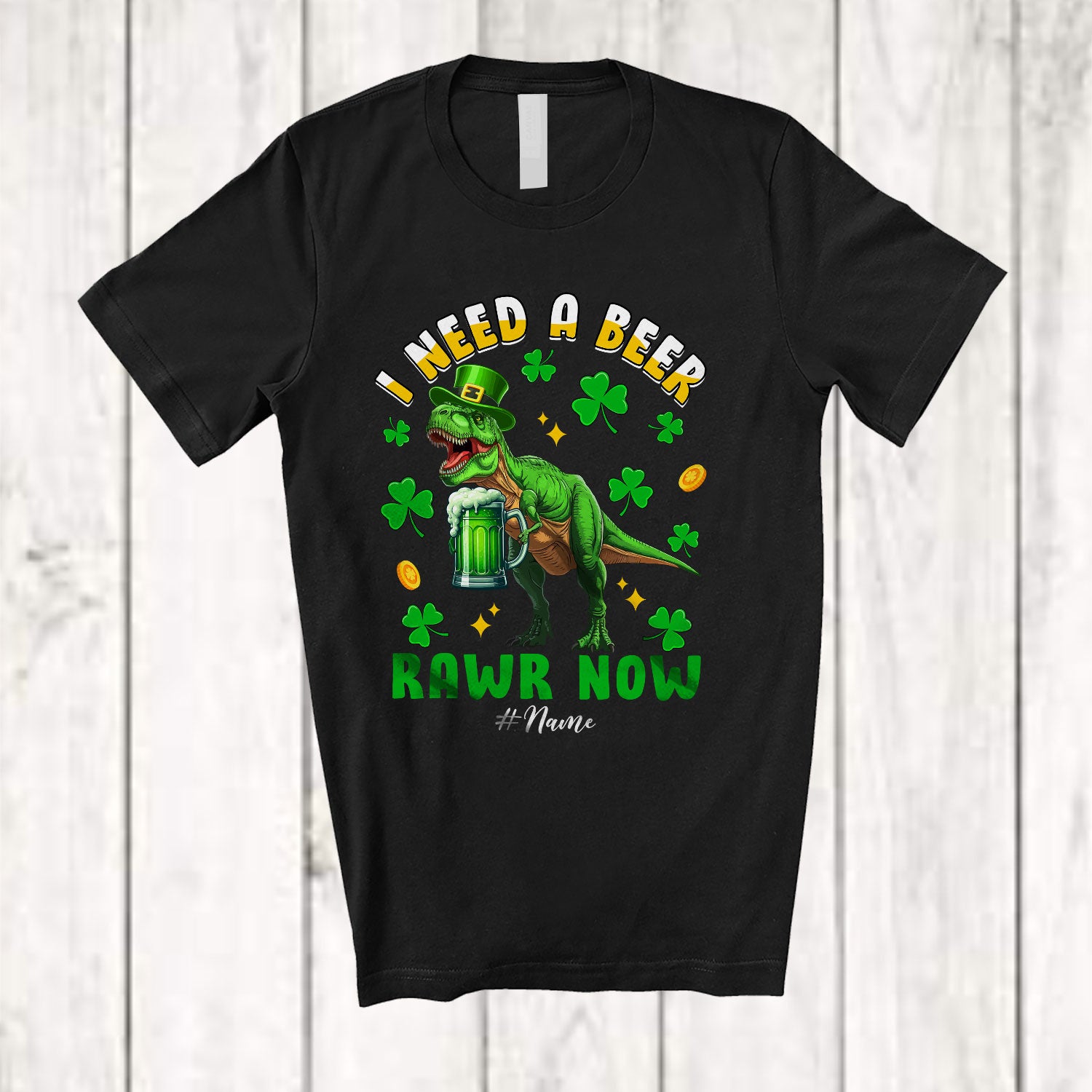 Personalized I Need A Beer Rawr Now; Lovely St. Patrick's Day Custom Name T-Rex Drinking Beer T-Shirt