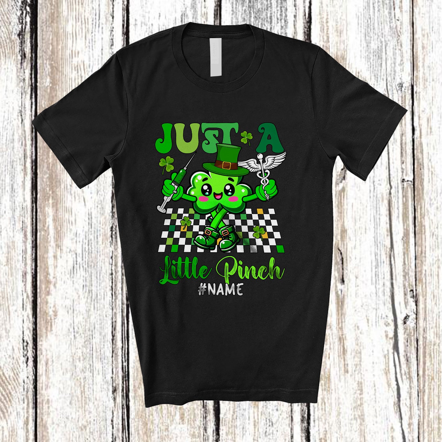 • Personalized Just a Little Pinch; Cheerful St. Patrick's Day Shamrock Custom Name Nurse; Family T-Shirt. This cotton t-shirt is a durable staple product with a classic fit. One of the most popular items, it has a relaxed style made for everyday and casual wear.