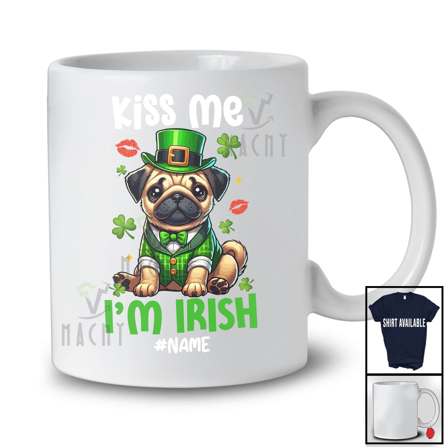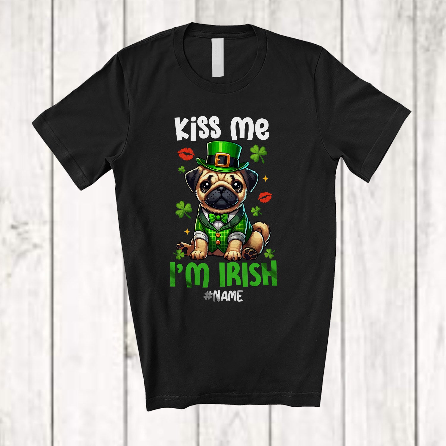 • Personalized Kiss Me I'm Irish; Fantastic St. Patrick's Day Custom Name Pug Leprechaun Owner T-Shirt. This cotton t-shirt is a durable staple product with a classic fit. One of the most popular items, it has a relaxed style made for everyday and casual wear.