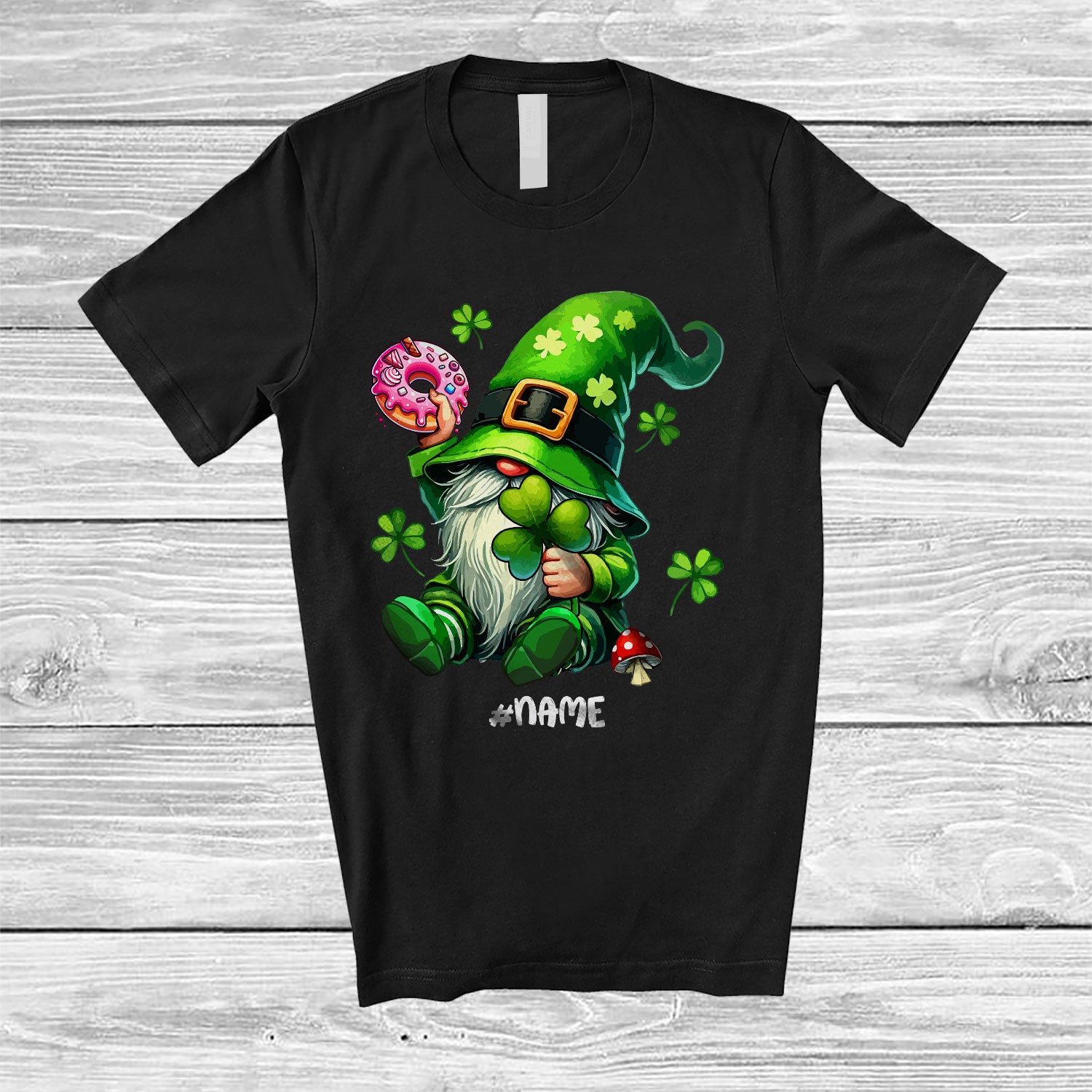 Personalized Leprechaun Gnome Eat Donut; Happy St. Patrick's Day Custom Name Food Lover T-Shirt. This cotton t-shirt is a durable staple product with a classic fit. One of the most popular items, it has a relaxed style made for everyday and casual wear.