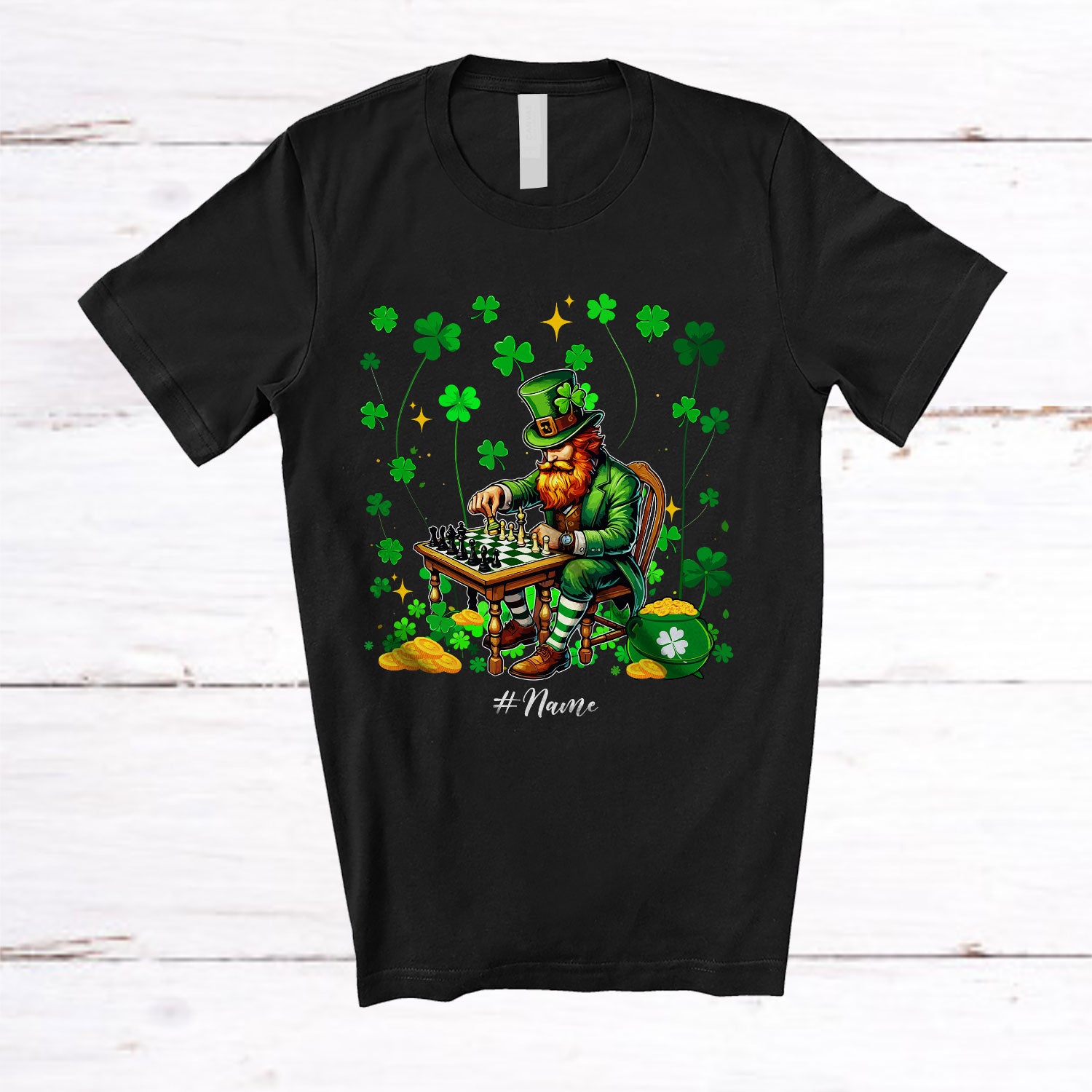 Personalized Leprechaun Playing Chess; Joyful St. Patrick's Day Shamrock; Custom Name Player T-Shirt