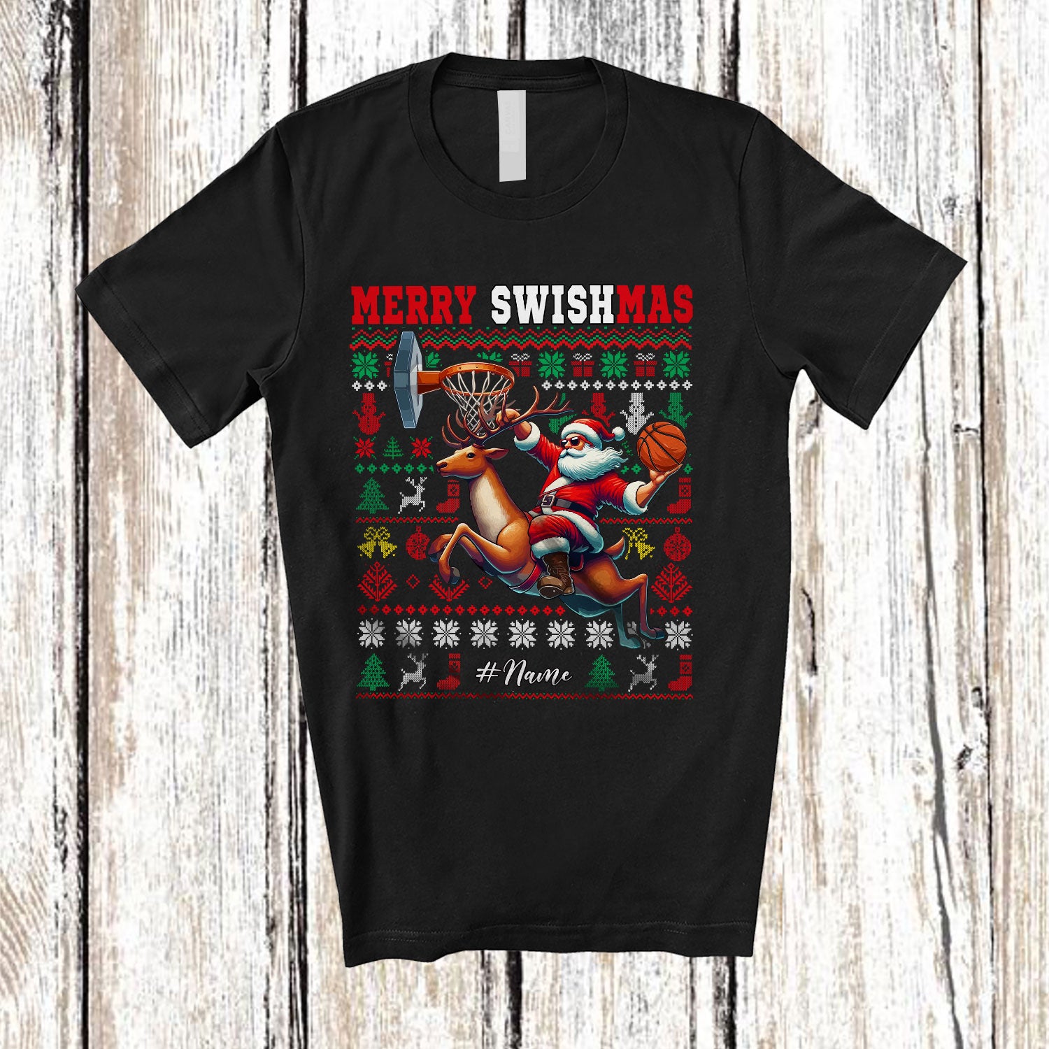 Personalized Merry Swishmas; Amusing Christmas Santa Riding Reindeer Playing Basketball Player; Sweater Sport T-Shirt