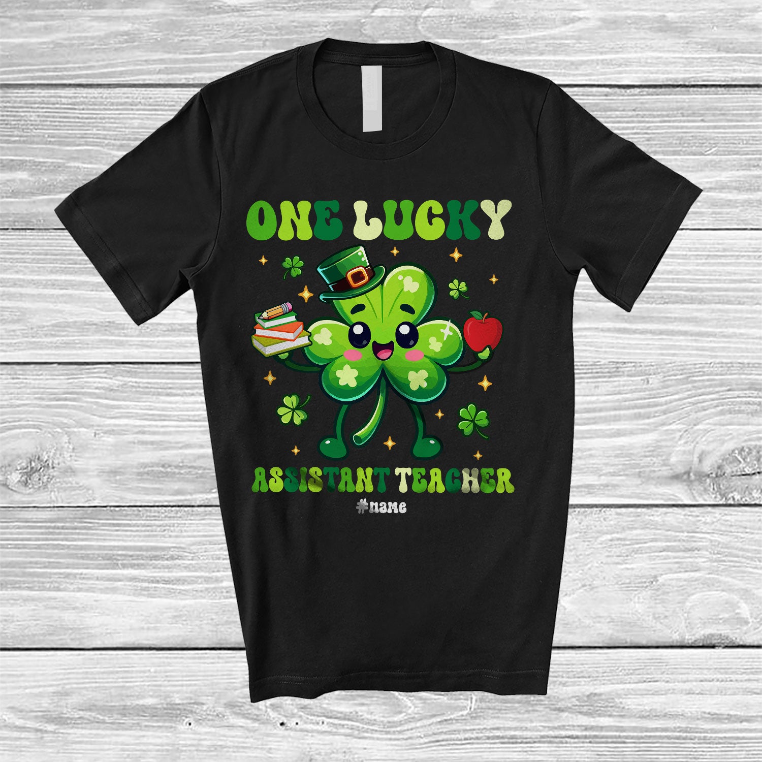 • Personalized One Lucky Assistant Teacher; Awesome St. Patrick's Day Custom Name Irish Shamrocks T-Shirt. This cotton t-shirt is a durable staple product with a classic fit. One of the most popular items, it has a relaxed style made for everyday and casual wear.