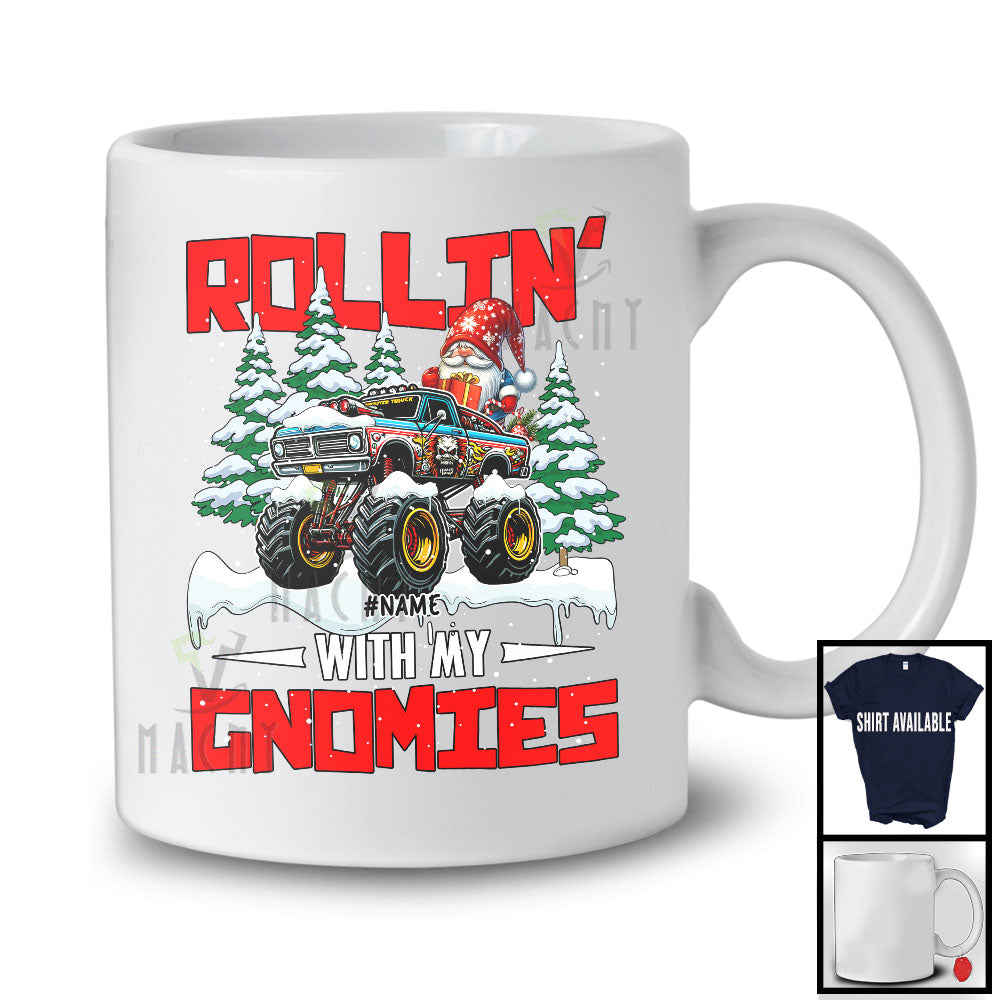 • Personalized Rollin' With My Gnomies; Awesome Christmas Custom Name Gnome Driving Monster Truck T-Shirt. This cotton t-shirt is a durable staple product with a classic fit. One of the most popular items, it has a relaxed style made for everyday and casual wear.
