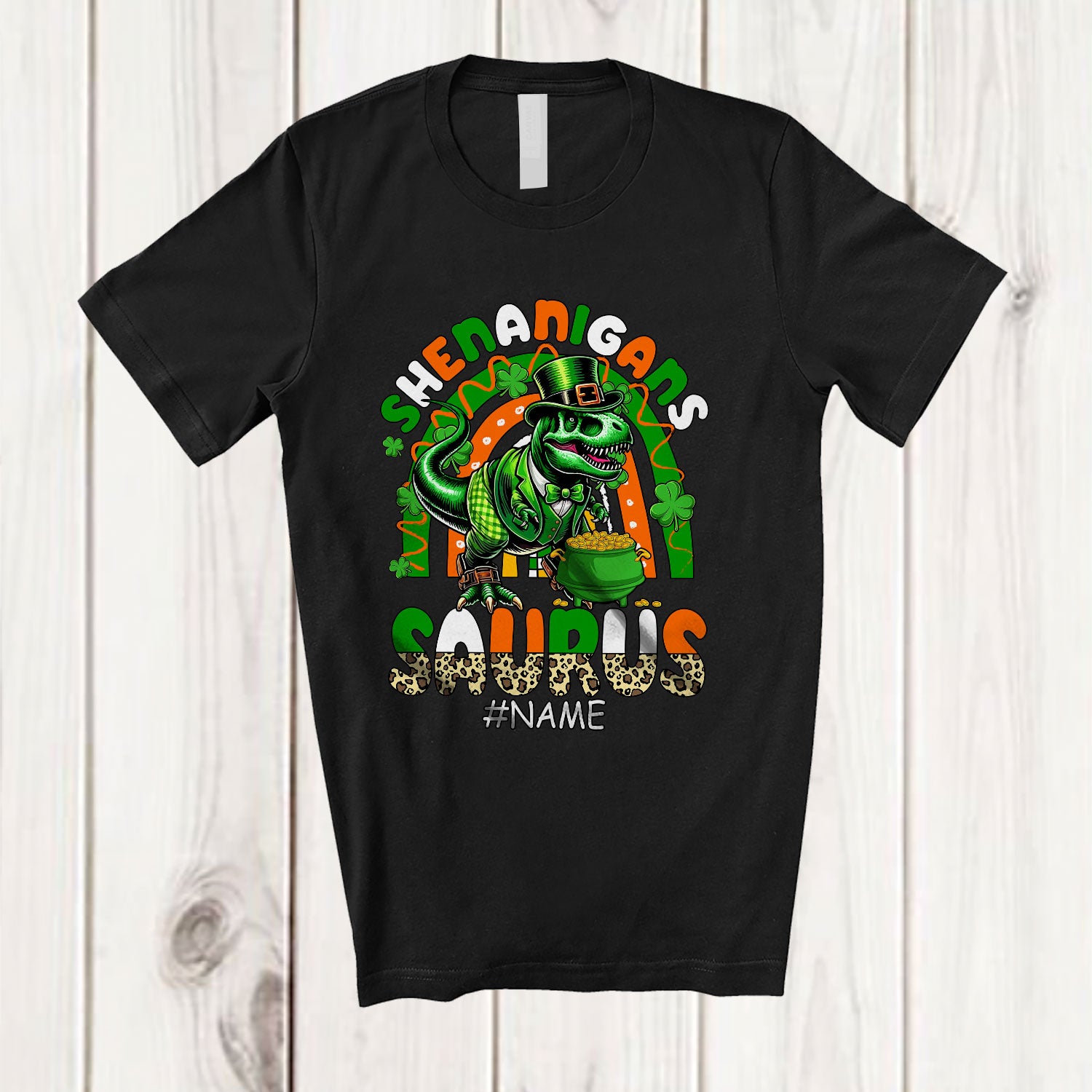 Personalized Shenanigans Saurus; Adorable St. Patrick's Day Custom Name T-Rex; Rainbow T-Shirt. This cotton t-shirt is a durable staple product with a classic fit. One of the most popular items, it has a relaxed style made for everyday and casual wear.