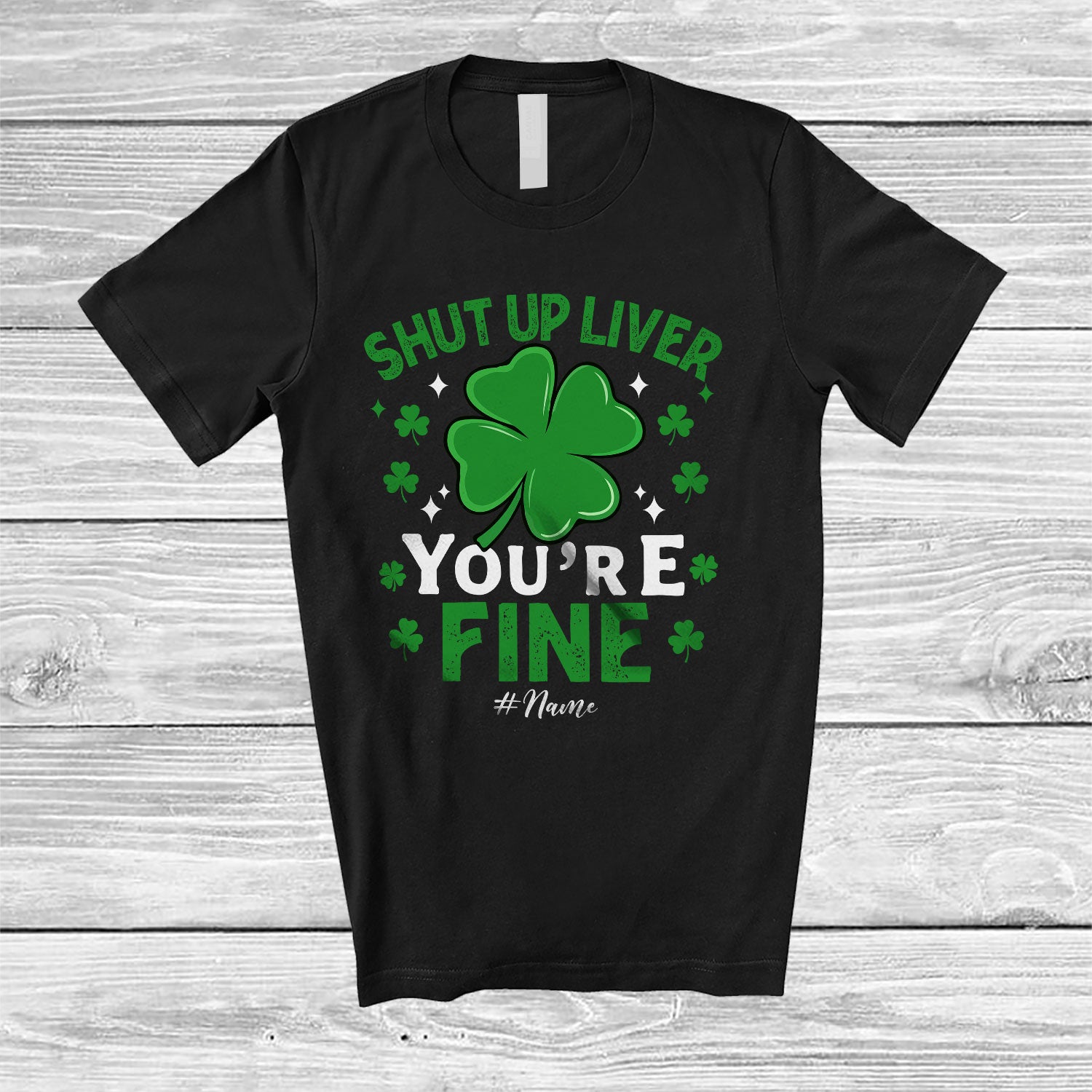 Personalized Shut Up Liver You're Fine; Cheerful St. Patrick's Day Shamrock Custom Name Family T-Shirt. This cotton t-shirt is a durable staple product with a classic fit. One of the most popular items, it has a relaxed style made for everyday and casual wear.