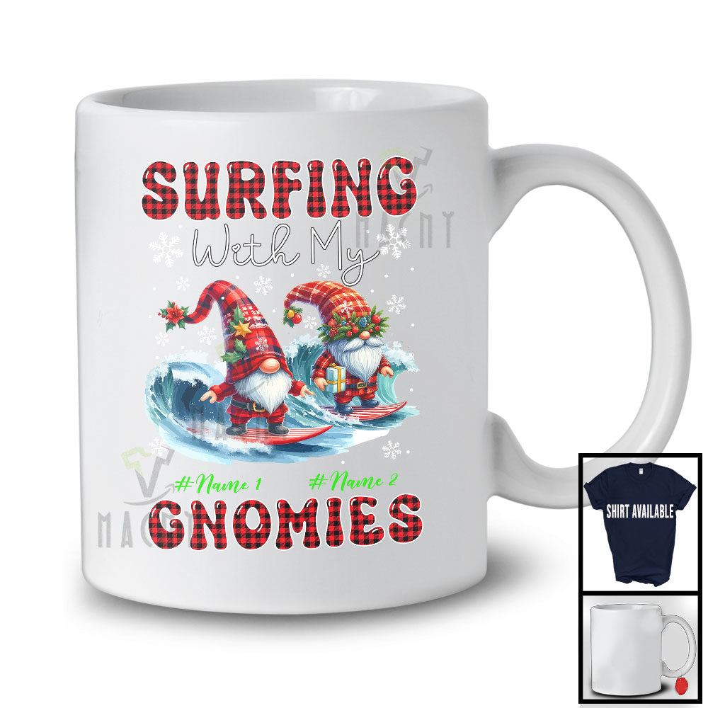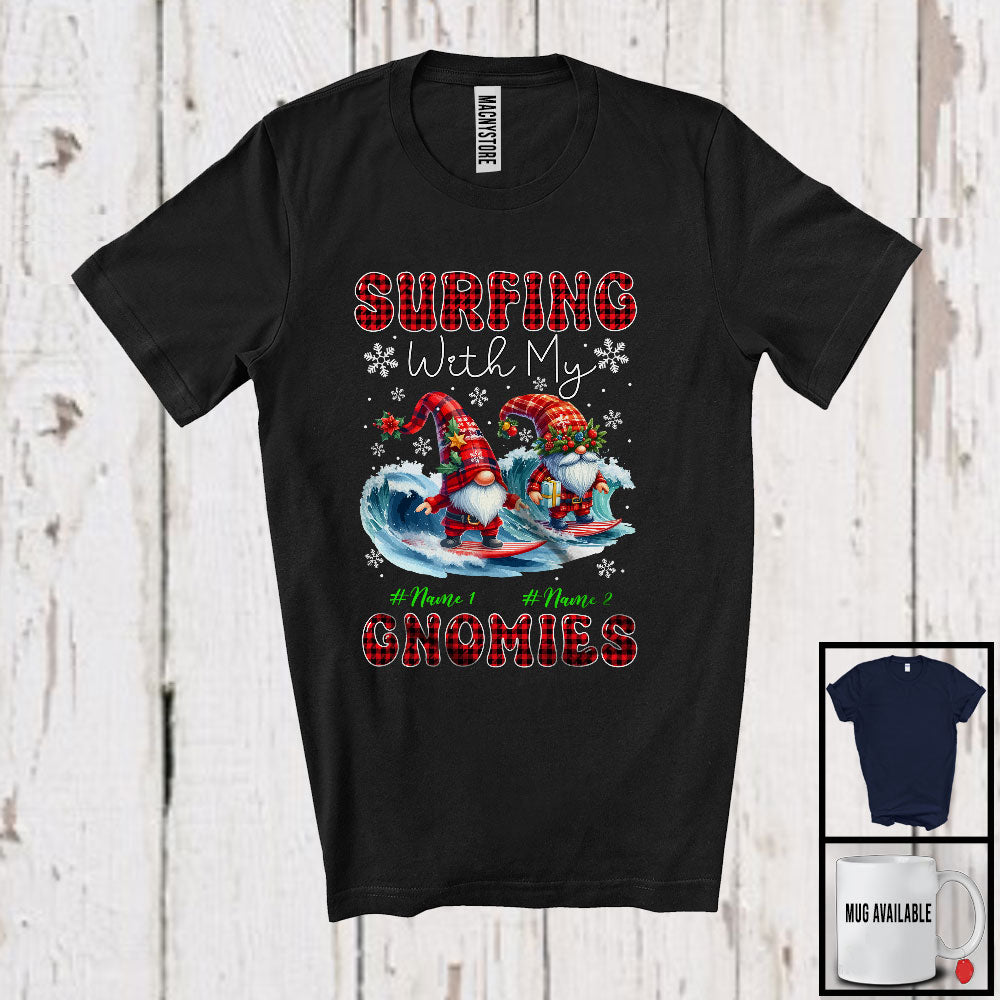 • Personalized Surfing With My Gnomies; Lovely Christmas Plaid Custom Name Couple Gnomes T-Shirt. This cotton t-shirt is a durable staple product with a classic fit. One of the most popular items, it has a relaxed style made for everyday and casual wear.
