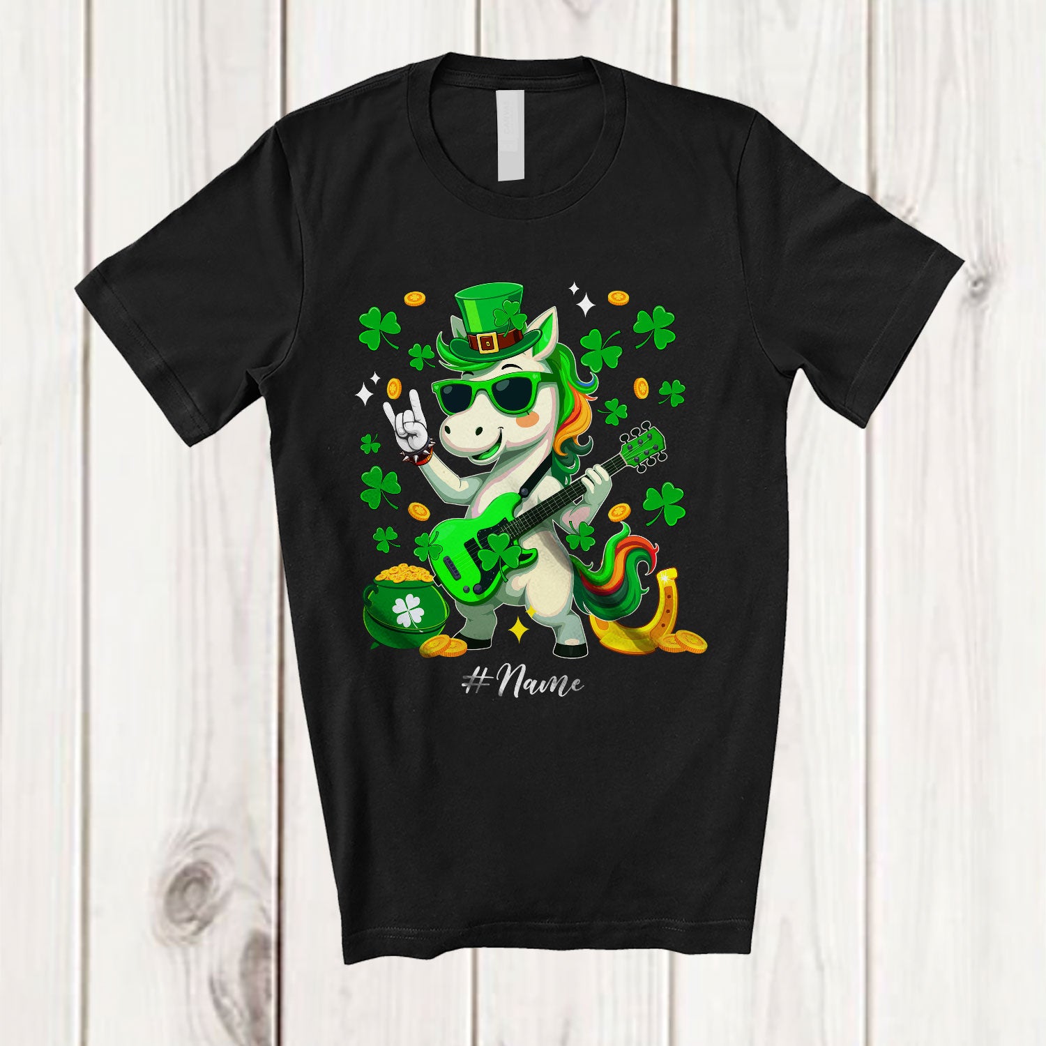 Personalized Unicorn Rock; Lovely St. Patrick's Day Unicorn Bass Player; Custom Name Guitarist T-Shirt