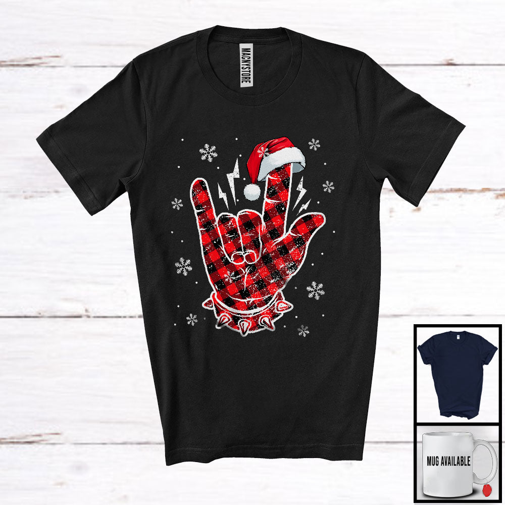 Red Plaid Santa Rock Hand Sign; Joyful Christmas ASL Sign Language; X-mas Music Family Group T-Shirt