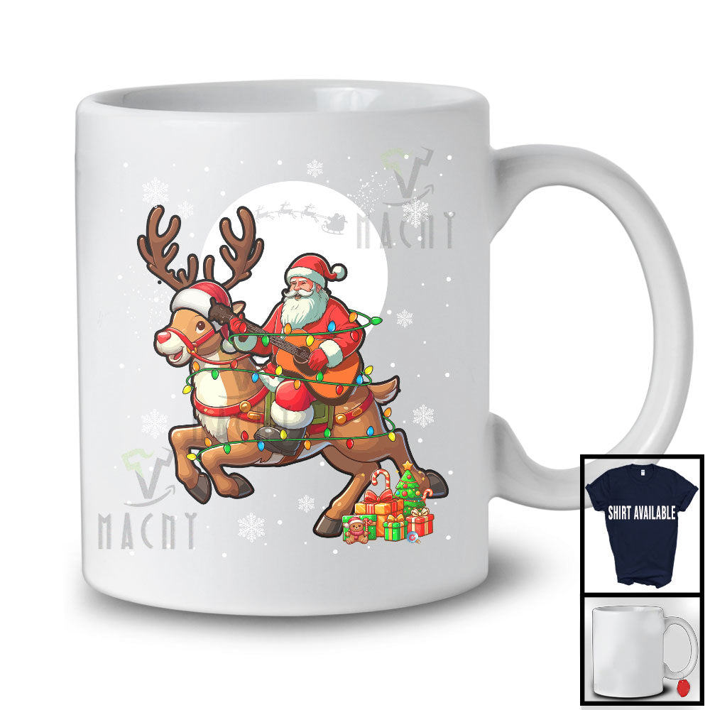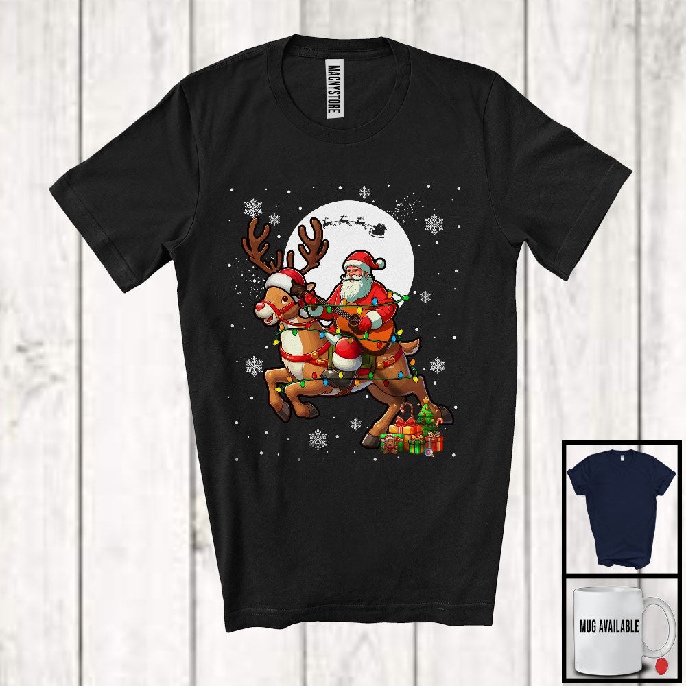 Santa Playing Guitar Riding Reindeer; Awesome Christmas Lights Guitar Player; Musical Instruments T-Shirt
