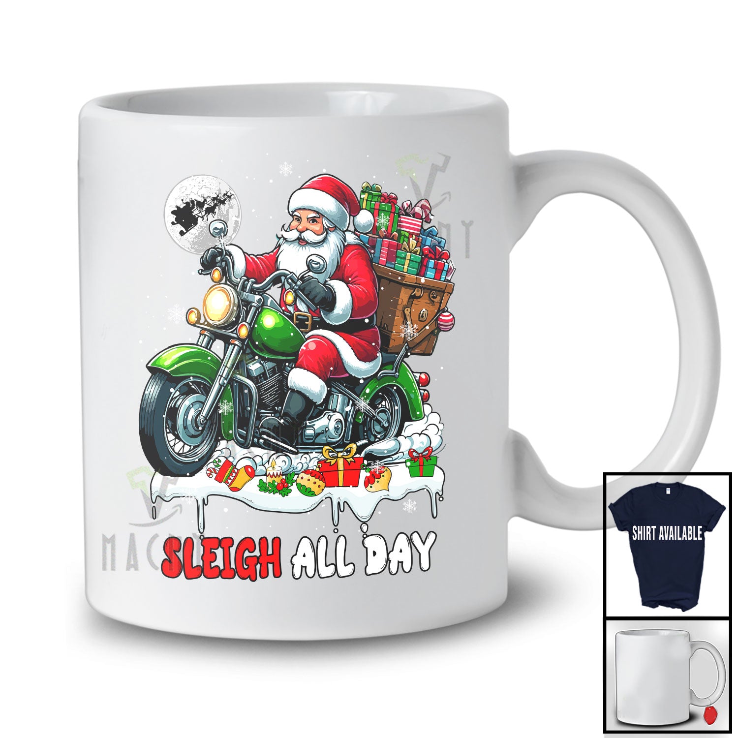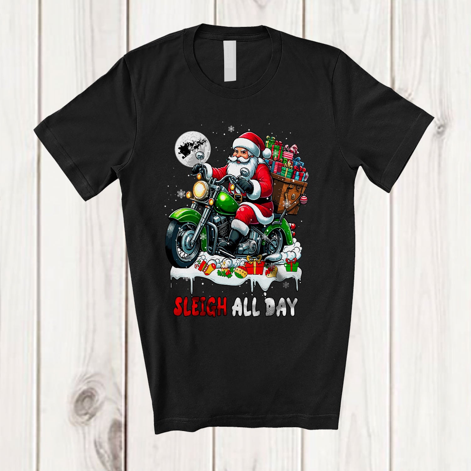 • Sleigh All Day; Fantastic Christmas Snow Christmas Santa Riding Motorcycle; Family Group T-Shirt. This cotton t-shirt is a durable staple product with a classic fit. One of the most popular items, it has a relaxed style made for everyday and casual wear.