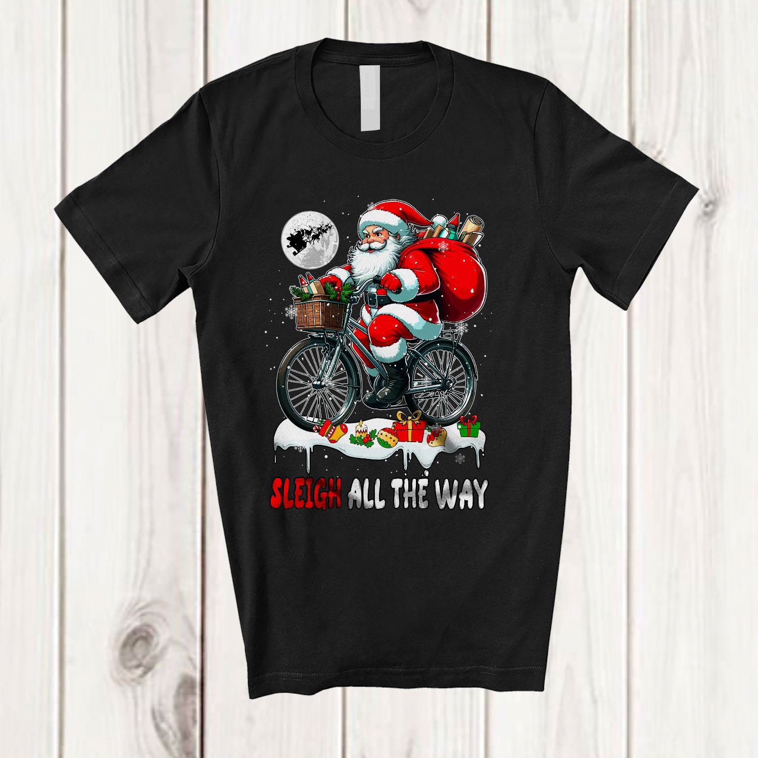 Sleigh All The Way; Fantastic Christmas Snow Christmas Santa Riding Bicycle; Family Group T-Shirt. This cotton t-shirt is a durable staple product with a classic fit. One of the most popular items, it has a relaxed style made for everyday and casual wear.