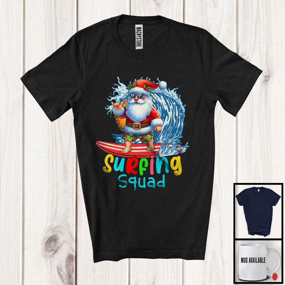• Surfing Squad, Joyful Summer Vacation Christmas In July Santa Waving, Hawaiian Family Group T-Shirt. This cotton t-shirt is a durable staple product with a classic fit. One of the most popular items, it has a relaxed style made for everyday and casual wear.