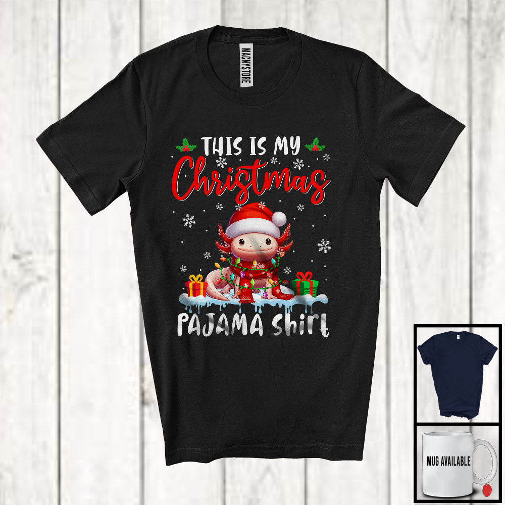 This Is My Christmas Pajama Shirt; Amusing X-mas Lights Lovely Santa Axolotl; Animal Lover T-Shirt. This cotton t-shirt is a durable staple product with a classic fit. One of the most popular items, it has a relaxed style made for everyday and casual wear.