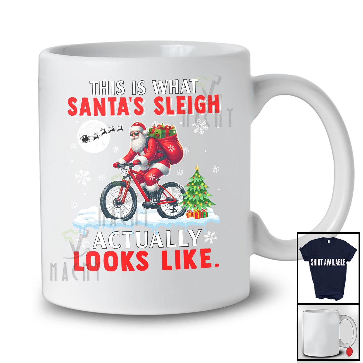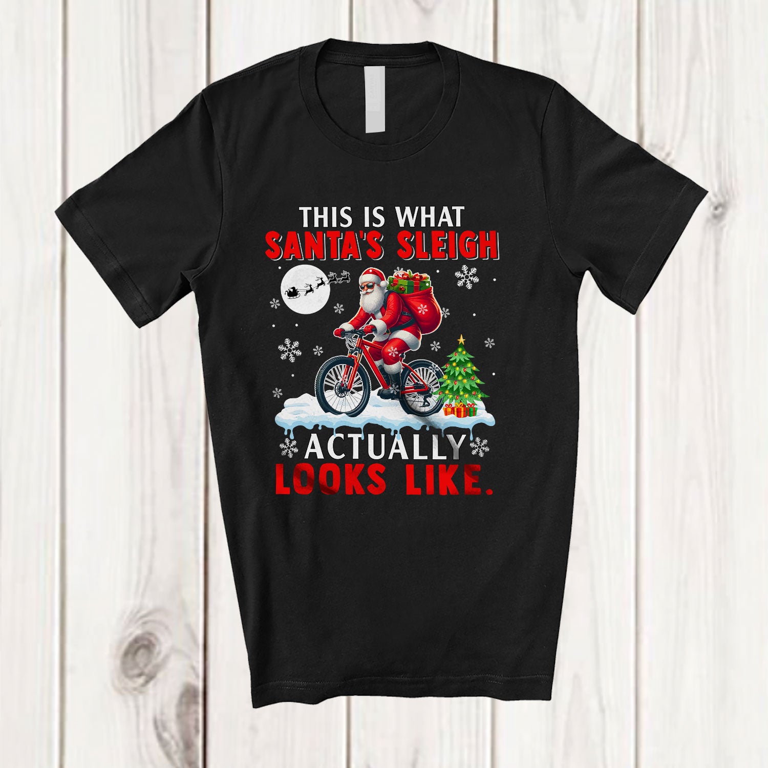 This Is What Santa's Sleigh Actually Looks Like; Amazing Christmas Santa Bicycle Rider; Family T-Shirt. This cotton t-shirt is a durable staple product with a classic fit. One of the most popular items, it has a relaxed style made for everyday and casual wear.